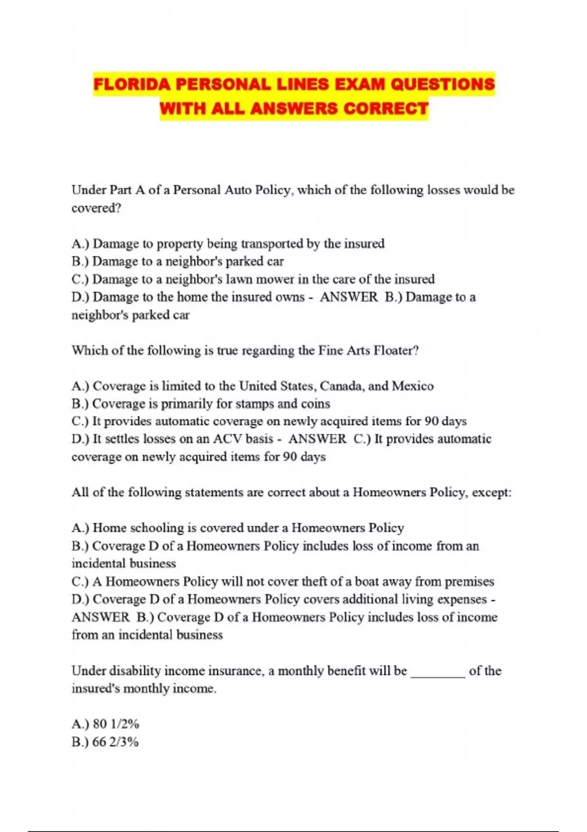 ALL PERSONAL LINES PACKAGED EXAMS: QUESTIONS WITH 100% VERIFIED ANSWERS LATEST UPDATED