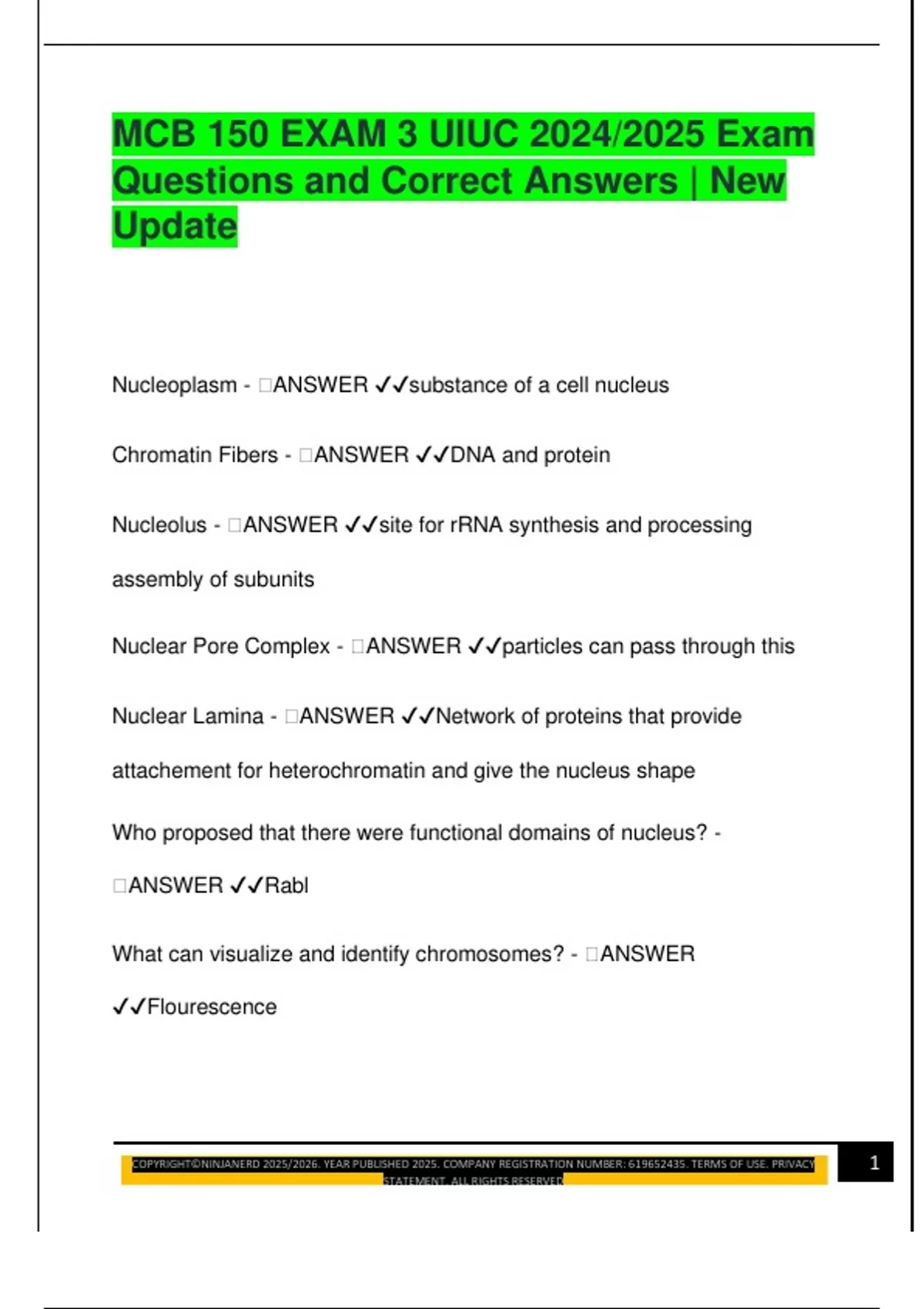 MCB 150 EXAM 3 UIUC 2024/2025 Exam Questions and Correct Answers | New Update Nucleoplasm -