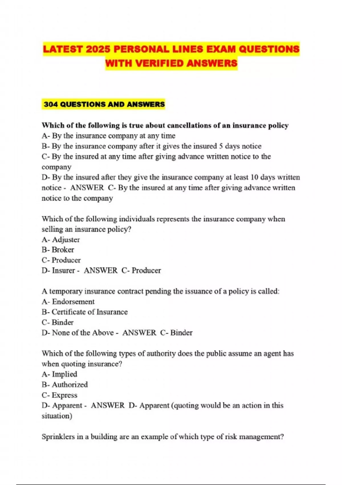 ALL PERSONAL LINES PACKAGED EXAMS: QUESTIONS WITH 100% VERIFIED ANSWERS LATEST UPDATED