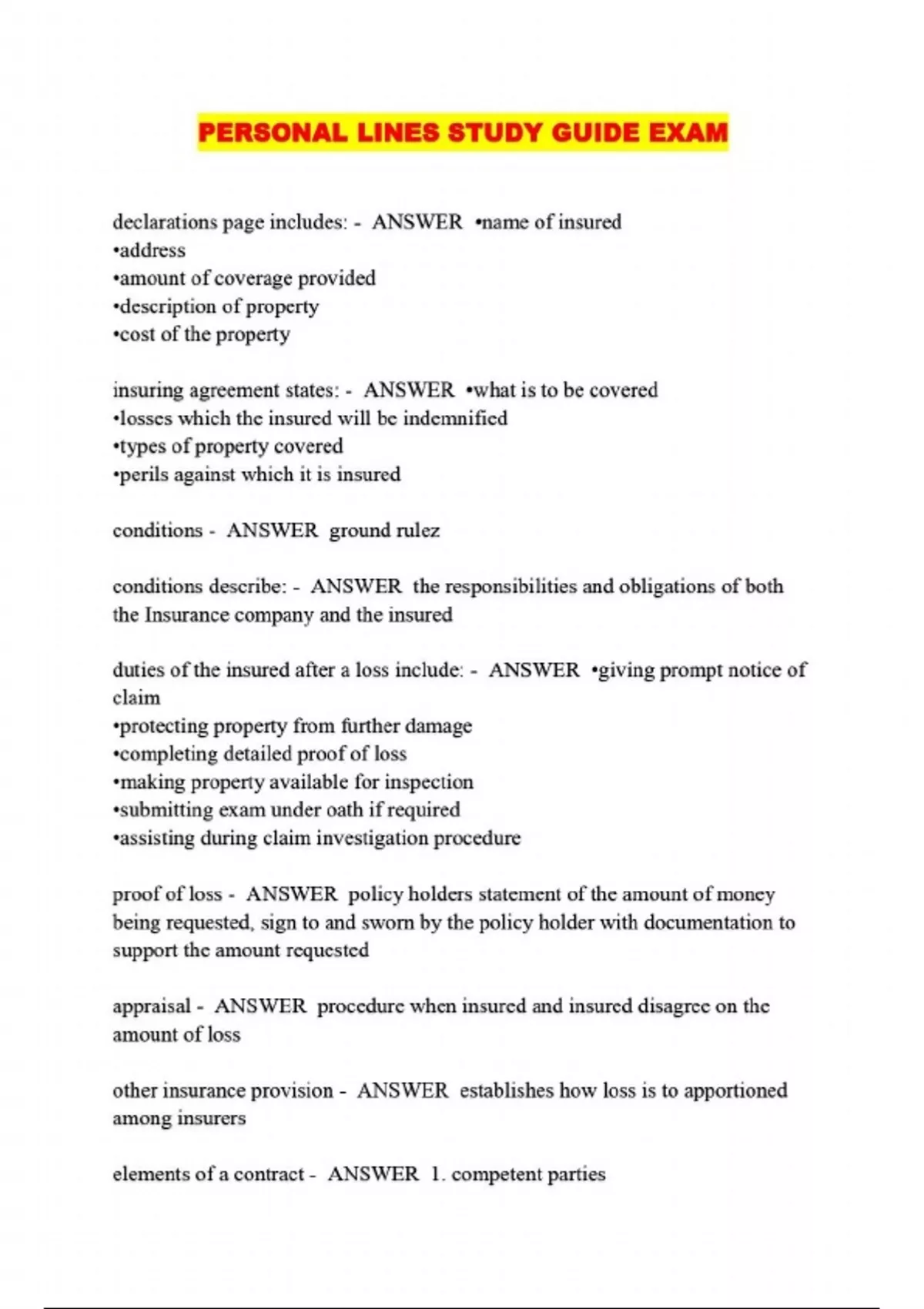 PERSONAL LINES STUDY GUIDE EXAM,....