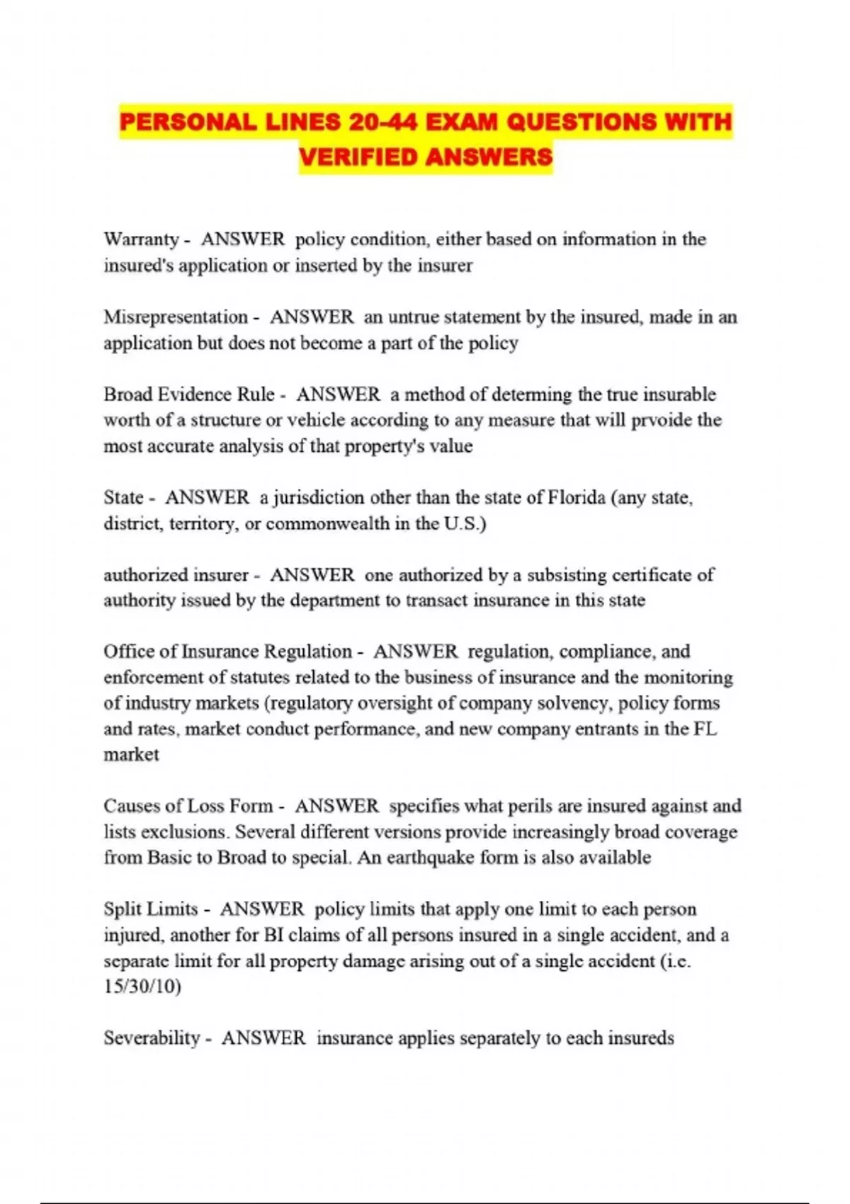 ALL PERSONAL LINES PACKAGED EXAMS: QUESTIONS WITH 100% VERIFIED ANSWERS LATEST UPDATED