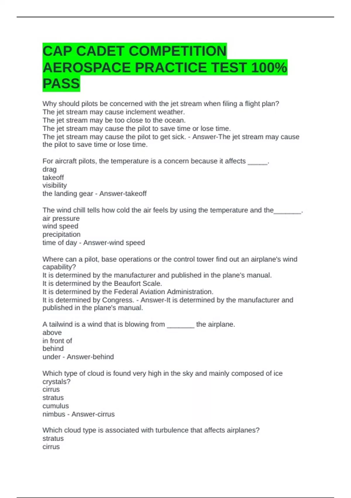 CAP CADET COMPETITION AEROSPACE PRACTICE TEST 100% PASS