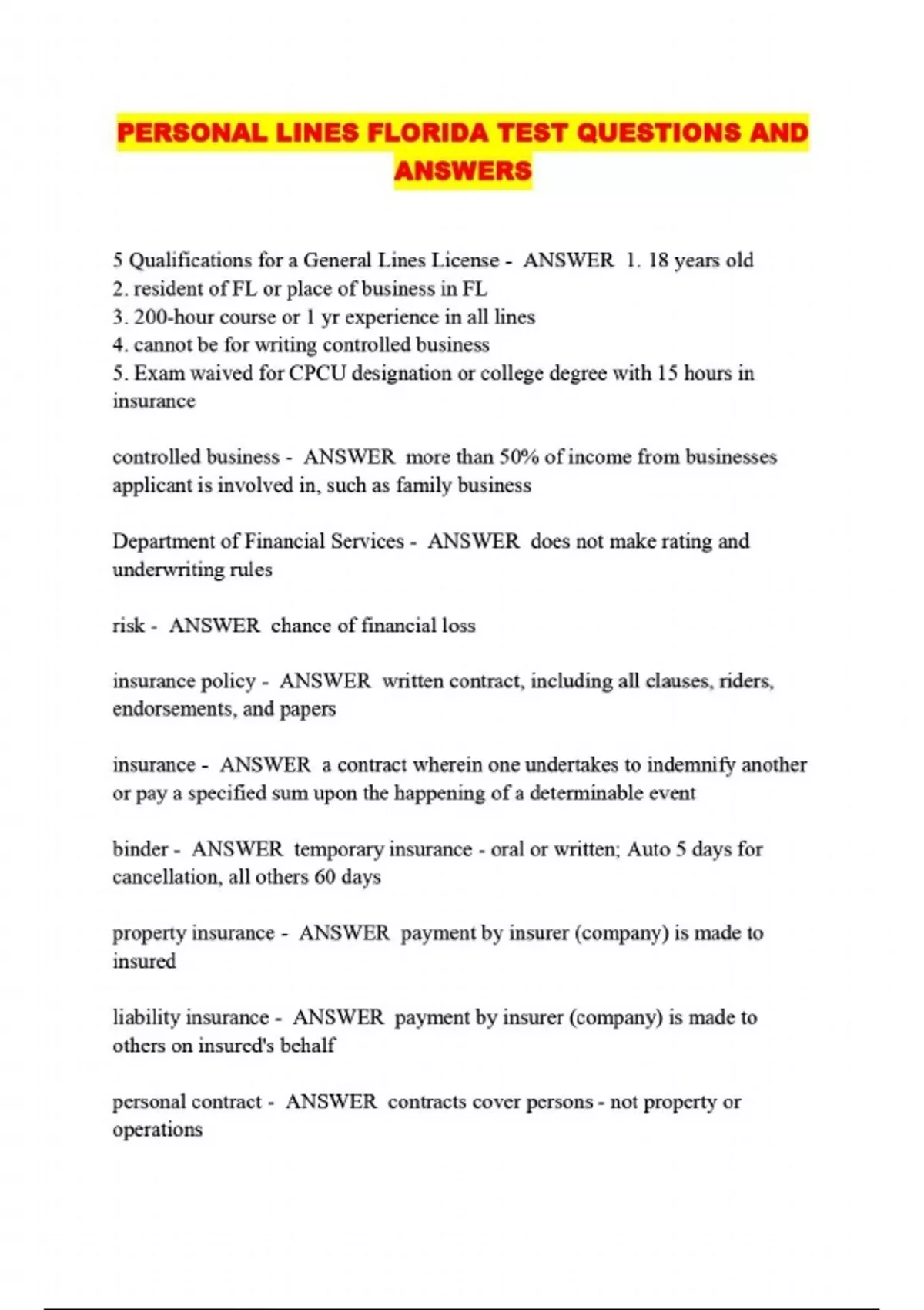 PERSONAL LINES FLORIDA TEST QUESTIONS AND ANSWERS....