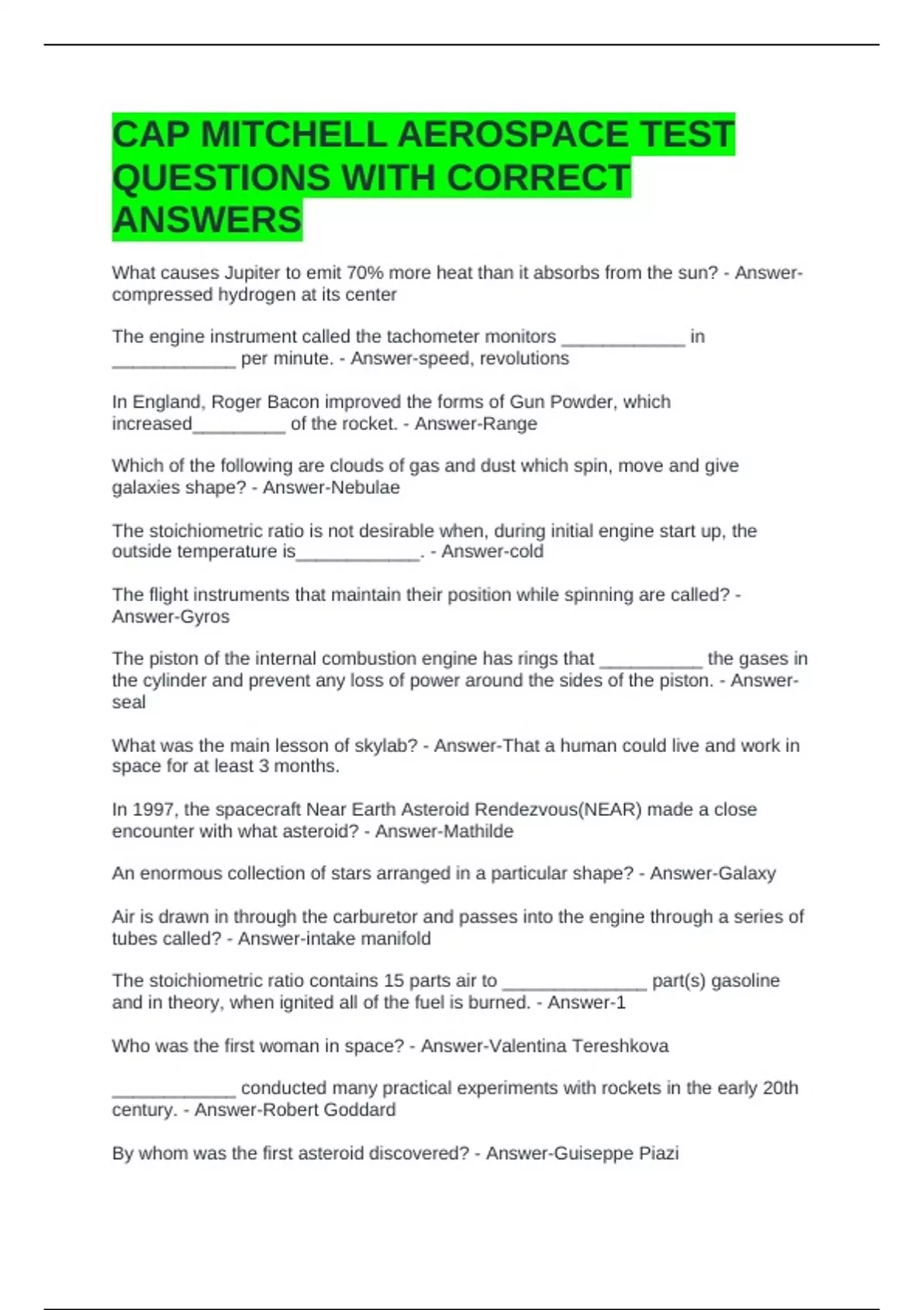 CAP MITCHELL AEROSPACE TEST QUESTIONS WITH CORRECT ANSWERS