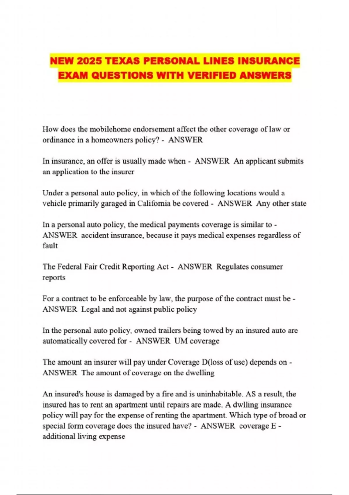 NEW 2025 TEXAS PERSONAL LINES INSURANCE EXAM QUESTIONS WITH VERIFIED ANSWERS....