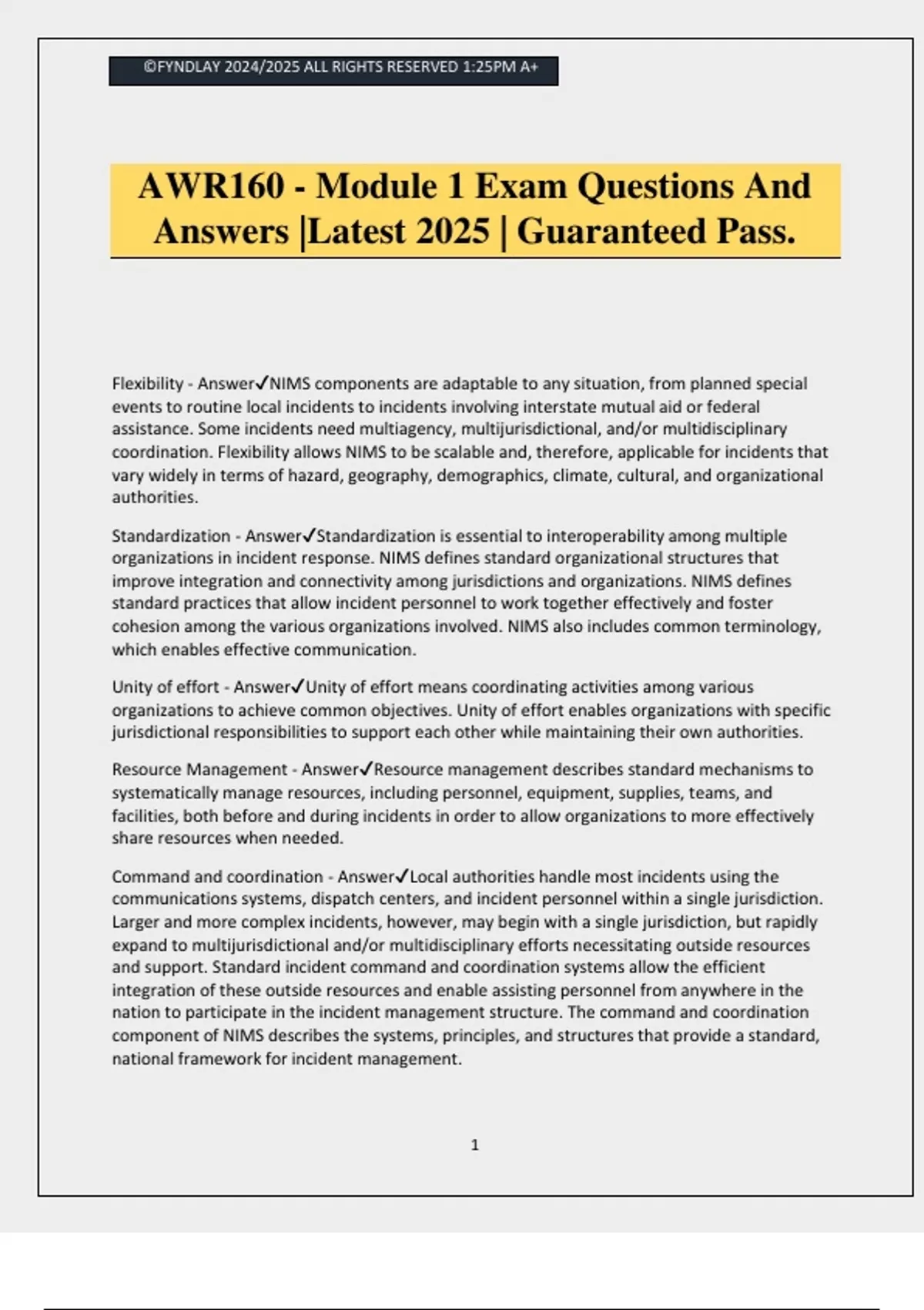 ©FYNDLAY 2024/2025 ALL RIGHTS RESERVED 1:25PM A+ 1 AWR160 - Module 1 Exam Questions And Answers |Latest 2025 | Guaranteed Pass. Flexibility - AnswerNIMS components are adaptable to any situation, from planned special events to routine local incidents to incidents involving interstate mutual aid or federal assistance. Some incidents need multiagency, multijurisdictional, and/or multidisciplinary coordination. Flexibility allows NIMS to be scalable and, therefore, applicable for incidents that vary widely in terms of hazard, geography, demographics, climate, cultural, and organizational authorities. Standardization - AnswerStandardization is essential to interoperability among multiple organizations in incident response. NIMS defines standard organizational structures that improve integration and connectivity among jurisdictions and organizations. NIMS defines standard practices that allow incident personnel to work together effectively and foster cohesion among the various organizations involved. NIMS also includes common terminology, which enables effective communication. Unity of effort - AnswerUnity of effort means coordinating activities among various organizations to achieve common objectives. Unity of effort enables organizations with specific jurisdictional responsibilities to support each other while maintaining their own authorities. Resource Management - AnswerResource management describes standard mechanisms to systematically manage resources, including personnel, equipment, supplies, teams, and facilities, both before and during incidents in order to allow organizations to more effectively share resources when needed. Command and coordination - AnswerLocal authorities handle most incidents using the communications systems, dispatch centers, and incident personnel within a single jurisdiction. Larger and more complex incidents, however, may begin with a single jurisdiction, but rapidly expand to multijurisdictional and/or multidisciplinary efforts necessitating outside resources and support. Standard incident command and coordination systems allow the efficient integration of these outside resources and enable assisting personnel from anywhere in the nation to participate in the incident management structure. The command and coordination component of NIMS describes the systems, principles, and structures that provide a standard, national framework for incident management. ©FYNDLAY 2024/2025 ALL RIGHTS RESERVED 1:25PM A+ 2 Regardless of the size, complexity, or scope of the incident, effective command and coordination—using flexible and standard processes and systems—helps save lives and stabilize the situation. Incident command and coordination consist of four areas of responsibility:Tactical activities to apply resources on scene Incident support, typically conducted at Emergency Operations Centers (EOC), through operational and strategic coordination, resource acquisition and information gathering, analysis, and sharing Policy guidance and senior-level decision making Outreach and communication with the media and public to keep them informed about the incident Communications and information management - AnswerIncident personnel rely on flexible communications and information systems to obtain and provide accurate, timely, and relevant information. Establishing and maintaining situational awareness and ensuring accessibility and voice and data interoperability are the principal goals of the communications and information management component. Properly planned, established, and applied communications facilitate information dissemination among command and support elements and cooperating jurisdictions and organizations. Surprise - AnswerThe element of surprise in a terrorist attack offers more reward for the terrorist. Few people have prior knowledge of the attack plans; even fewer people have knowledge of the dates and times the attack will be executed. The shock value gained by the swiftness and suddenness of the attack bolsters the terrorist's self-image. Means - AnswerLimited only by the terrorist's imagination, the attack can range from releasing a chemical, biological, or radiological agent to detonating an Improvised Explosive Device (IED). According to federal authorities, the most likely terrorist scenario involves the use of an IED. Target - AnswerTargets can be individuals marked for assassination or the Critical Infrastructure and Key Resources (CIKR) sectors discussed in this module Reconnaissance - AnswerTerrorists gain understanding of a community's capability to respond to mass casualty incidents by surveying responder resources, and they plan accordingly. False alarm calls often enable terrorists to see firsthand how the community responds to an incident Significant Dates - AnswerAttacks have been related to historically significant dates. In 1995, the Alfred P. Murrah Federal Building was bombed on the anniversary of the April 19, 1993, Waco, Texas Branch Davidian fire. Since the terrorist attacks of September 11, 2001 and the train attacks in Madrid, Spain on March 11, 2004, these dates have also become significant HazMat responder levels: -