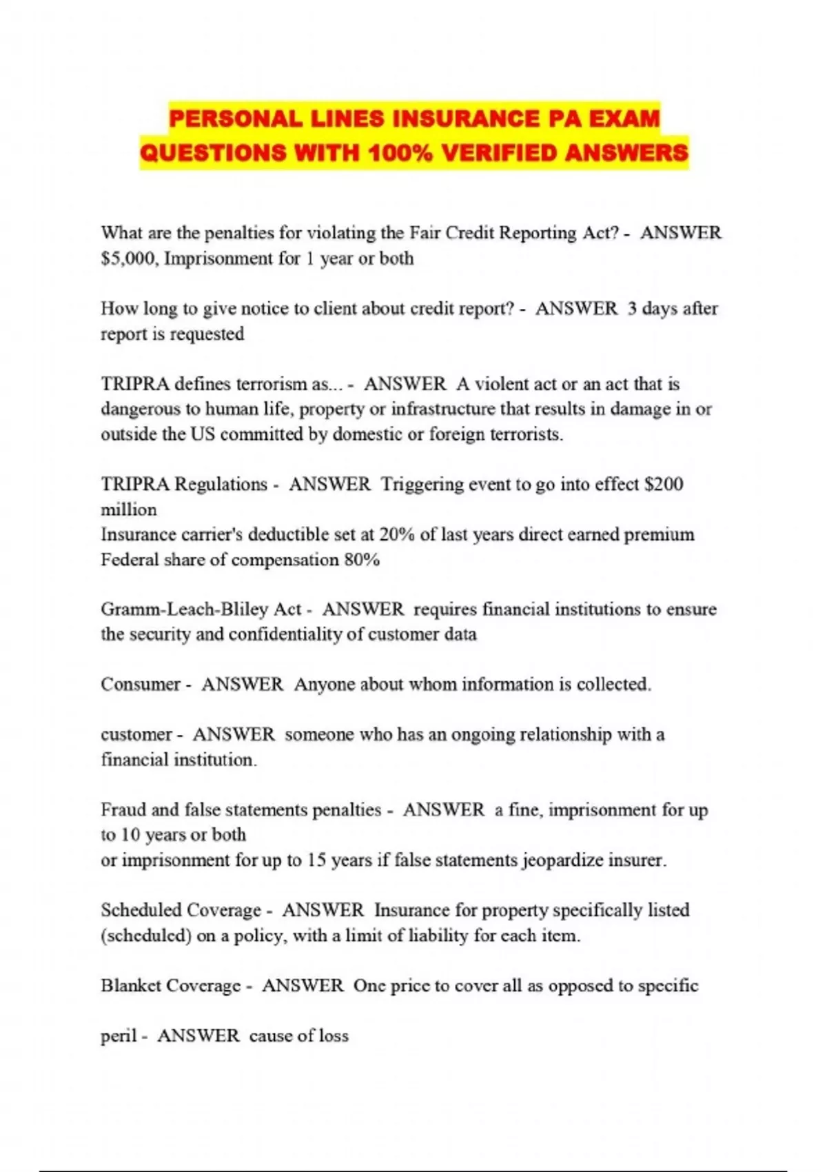 ALL PERSONAL LINES PACKAGED EXAMS: QUESTIONS WITH 100% VERIFIED ANSWERS LATEST UPDATED