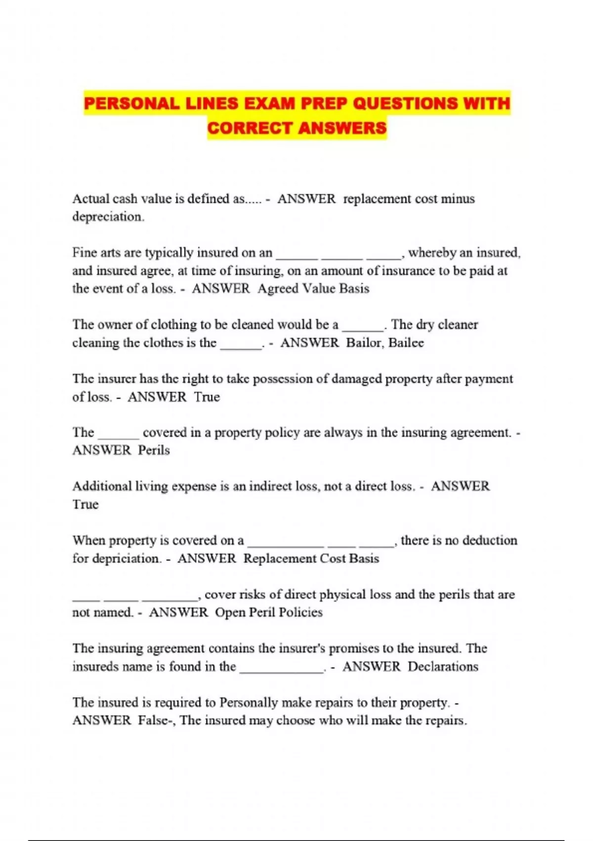PERSONAL LINES EXAM PREP QUESTIONS WITH CORRECT ANSWERS...