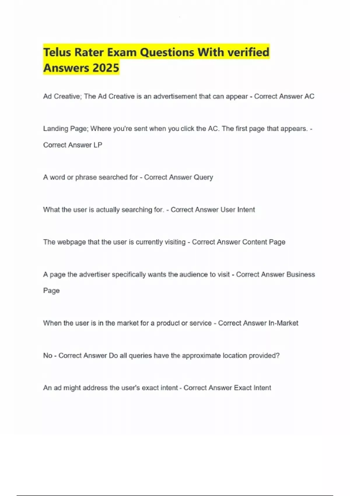 Telus Rater Exam Questions With verified Answers 2025 Ad Creative; The Ad Creative is an advertisement that can appear - Correct Answer AC Landing Page; Where you're sent when you click the AC. The first page that appears. - Correct Answer LP A word or phrase searched for - Correct Answer Query What the user is actually searching for. - Correct Answer User Intent The webpage that the user is currently visiting - Correct Answer Content Page A page the advertiser specifically wants the audience to visit - Correct Answer Business Page When the user is in the market for a product or service - Correct Answer In-Market No - Correct Answer Do all queries have the approximate location provided?