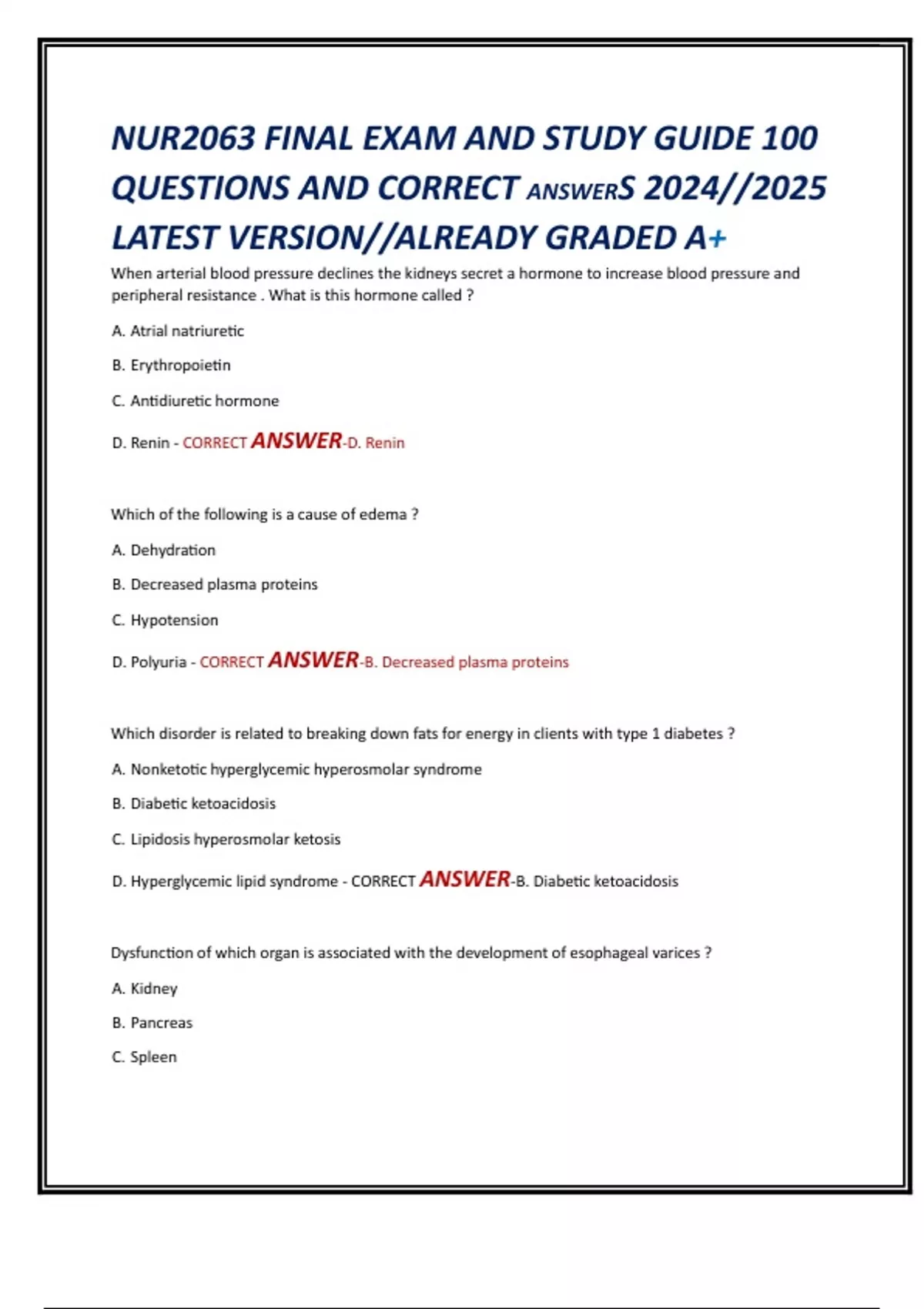 D. Renin - CORRECT ANSWER-D. Renin