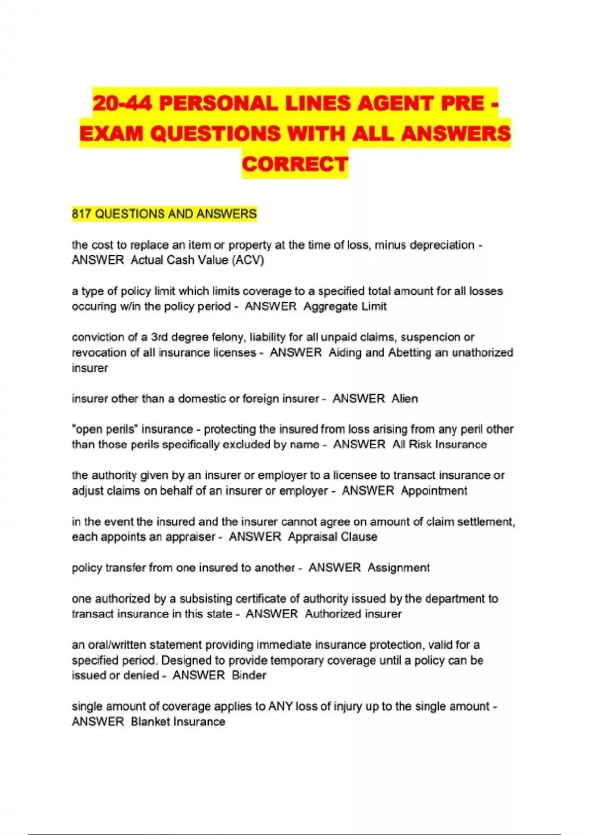 20-44 PERSONAL LINES AGENT PRE - EXAM QUESTIONS WITH ALL ANSWERS CORRECT.
