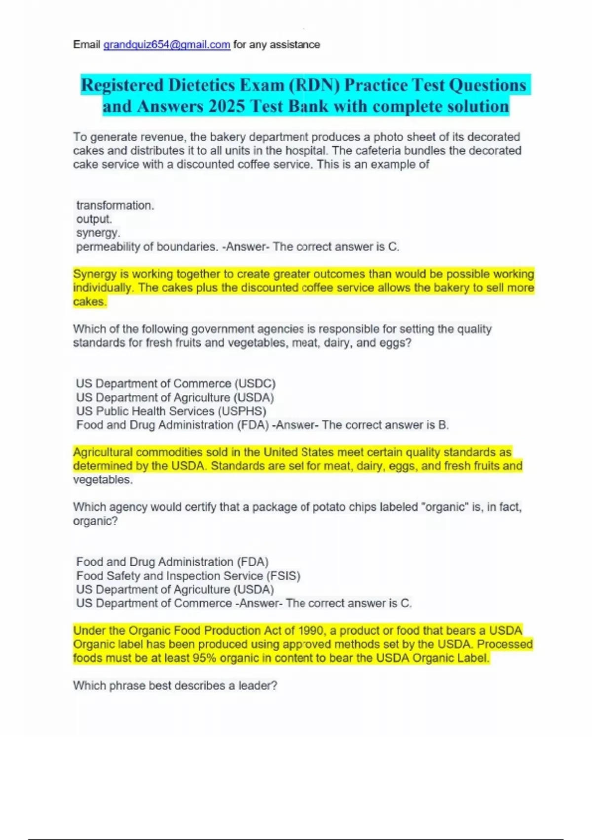Registered Dietetics Exam (RDN) Practice Test Questions and Answers 2025 Test Bank with complete solution