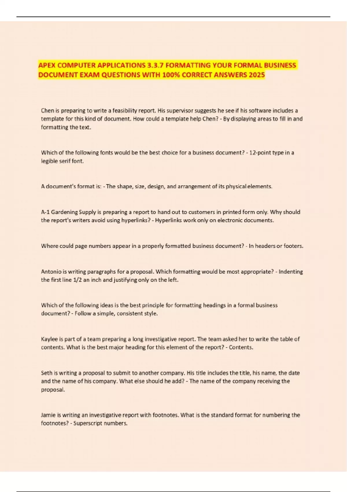APEX COMPUTER APPLICATIONS 3.3.7 FORMATTING YOUR FORMAL BUSINESS DOCUMENT EXAM QUESTIONS WITH 100% CORRECT ANSWERS 2025