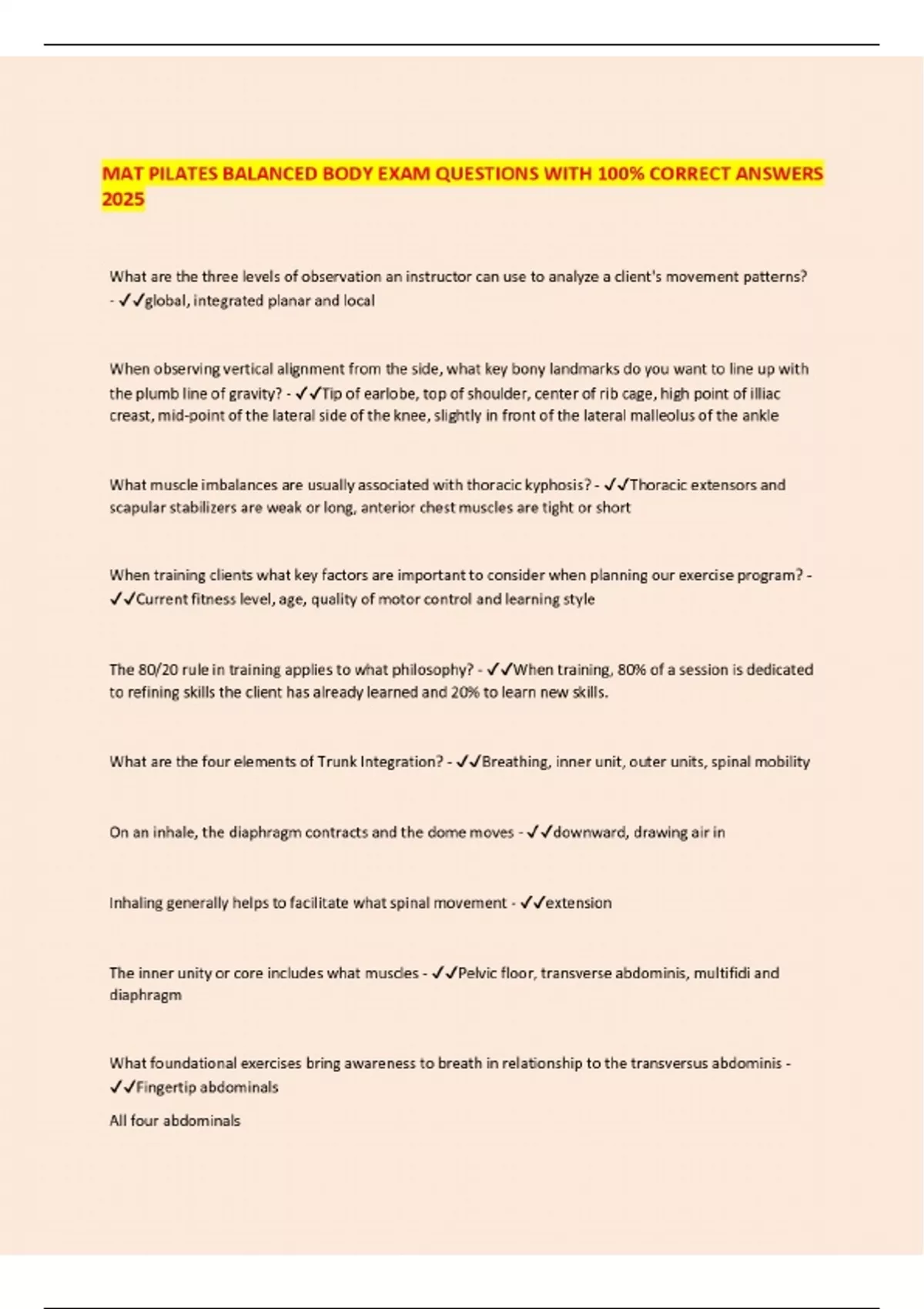 mat pilates balanced body exam questions with 100