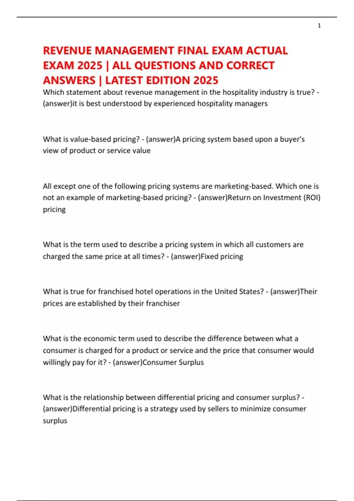 REVENUE MANAGEMENT FINAL EXAM ACTUAL EXAM 2025 | ALL QUESTIONS AND CORRECT ANSWERS | LATEST EDITION 2025