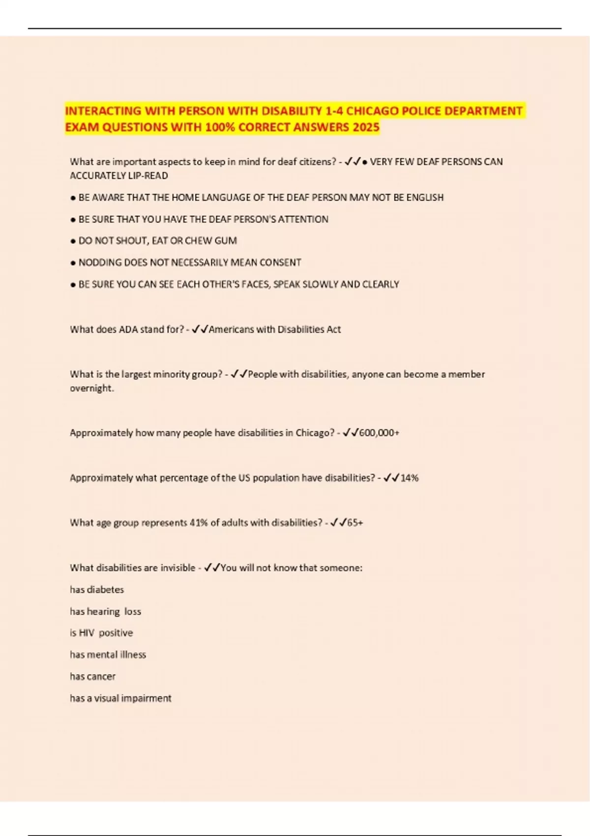 INTERACTING WITH PERSON WITH DISABILITY 1-4 CHICAGO POLICE DEPARTMENT EXAM QUESTIONS WITH 100% CORRECT ANSWERS 2025