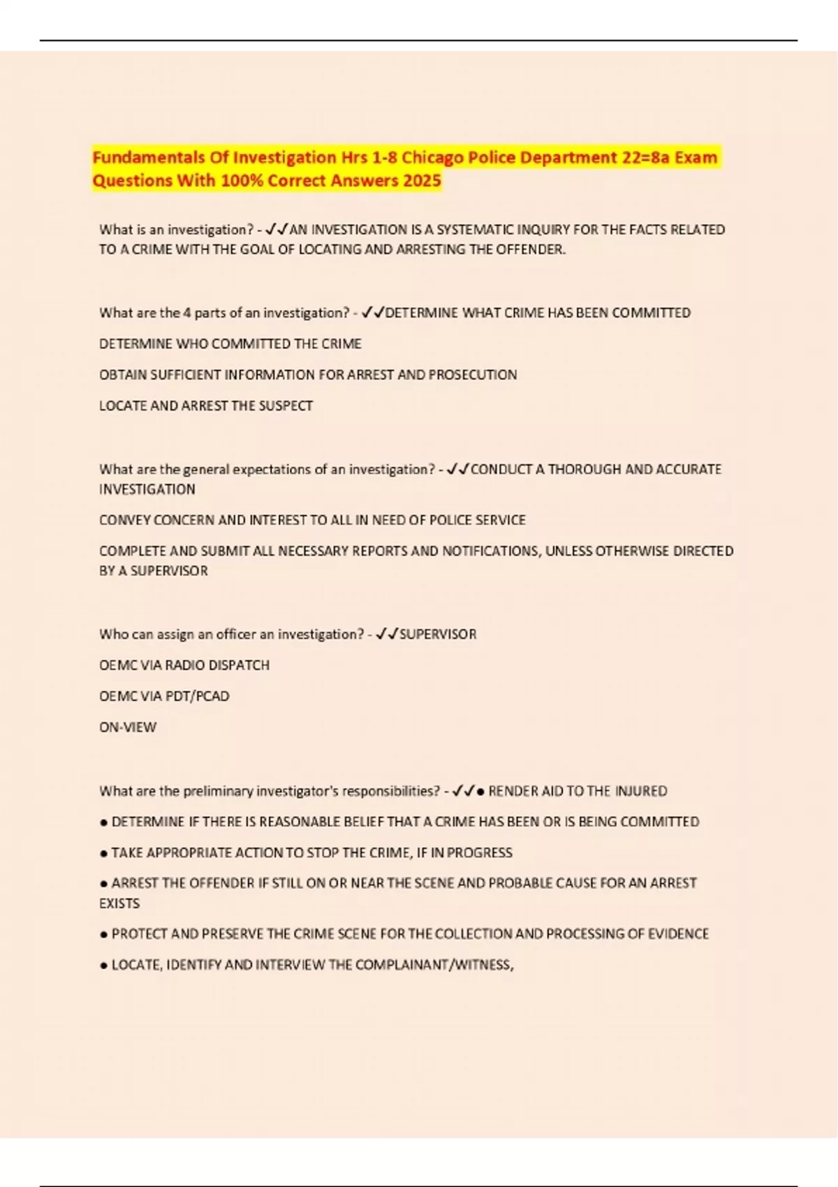 Fundamentals Of Investigation Hrs 1-8 Chicago Police Department 22=8a Exam Questions With 100% Correct Answers 2025