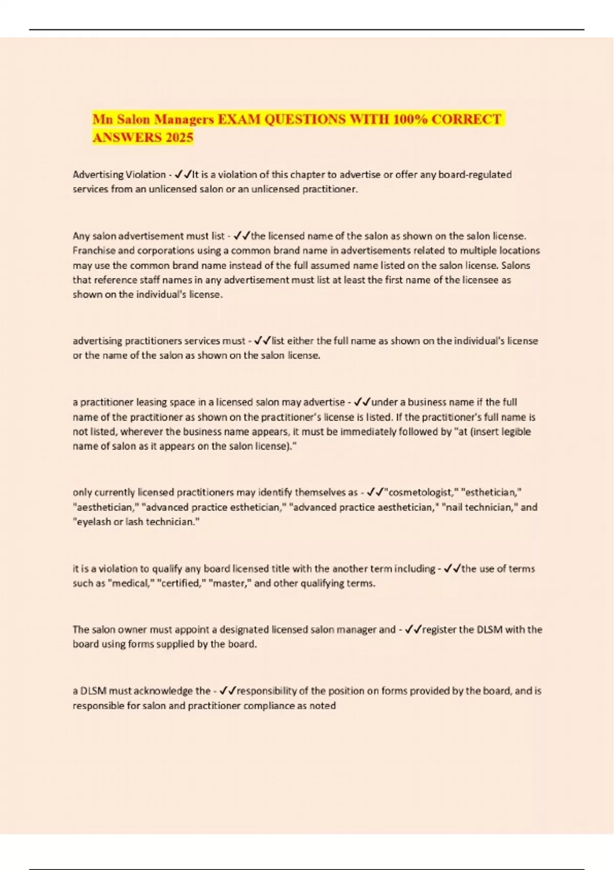 Package deal ::: MN Salon Manager EXAMS 2024-2025 with 100% Correct Answers