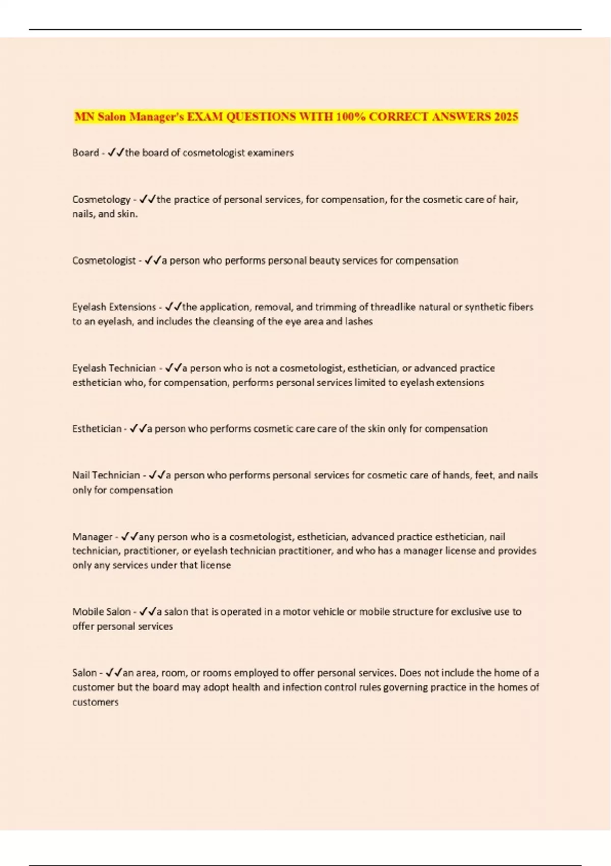 Package deal ::: MN Salon Manager EXAMS 2024-2025 with 100% Correct Answers