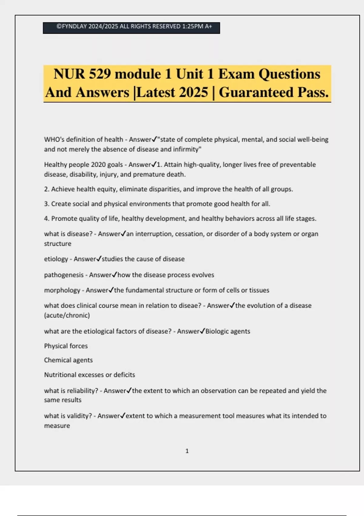 ©FYNDLAY 2024/2025 ALL RIGHTS RESERVED 1:25PM A+ 1 NUR 529 module 1 Unit 1 Exam Questions And Answers |Latest 2025 | Guaranteed Pass. WHO's definition of health - Answer"state of complete physical, mental, and social well-being and not merely the absence of disease and infirmity" Healthy people 2020 goals - Answer1. Attain high-quality, longer lives free of preventable disease, disability, injury, and premature death. 2. Achieve health equity, eliminate disparities, and improve the health of all groups. 3. Create social and physical environments that promote good health for all. 4. Promote quality of life, healthy development, and healthy behaviors across all life stages. what is disease? - Answeran interruption, cessation, or disorder of a body system or organ structure etiology - Answerstudies the cause of disease pathogenesis - Answerhow the disease process evolves morphology - Answerthe fundamental structure or form of cells or tissues what does clinical course mean in relation to diseae? - Answerthe evolution of a disease (acute/chronic) what are the etiological factors of disease? - AnswerBiologic agents Physical forces Chemical agents Nutritional excesses o