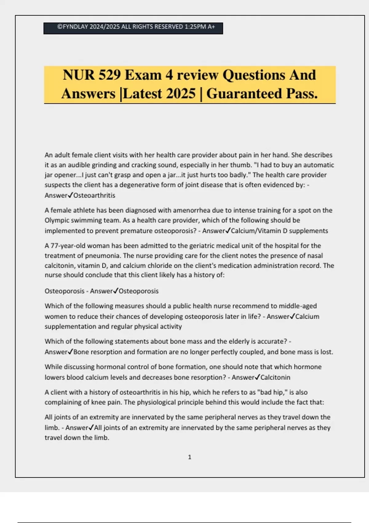 ©FYNDLAY 2024/2025 ALL RIGHTS RESERVED 1:25PM A+ 1 NUR 529 Exam 4 review Questions And Answers |Latest 2025 | Guaranteed Pass. An adult female client visits with her health care provider about pain in her hand. She describes it as an audible grinding and cracking sound, especially in her thumb. "I had to buy an automatic jar opener...I just can't grasp and open a jar...it just hurts too badly." The health care provider suspects the client has a degenerative form of joint disease that is often evidenced by: - AnswerOsteoarthritis A female athlete has been diagnosed with amenorrhea due to intense training for a spot on the Olympic swimming team. As a health care provider, which of the following should be implemented to prevent premature osteoporosis? - AnswerCalcium/Vitamin D supplements A 77-year-old woman has been admitted to the geriatric medical unit of the hospital for the treatment of pneumonia. The nurse providing care for the client notes the presence of nasal calcitonin, vitamin D, and calcium chloride on the client's medication administration record. The nurse should conclude that this client likely has a history of: Osteoporosis - AnswerOsteoporosis Which of the following measures should a public health nurse recommend to middle-aged women to reduce their chances of developing osteoporosis later in life? - AnswerCalcium supplementation and regular physical activity Which of the following statements about bone mass and the elderly is accurate? - AnswerBone resorption and formation are no longer perfectly coupled, and bone mass is lost. While discussing hormonal control of bone formation, one should note that which hormone lowers blood calcium levels and decreases bone resorption? - AnswerCalcitonin A client with a history of osteoarthritis in his hip, which he refers to as "bad hip," is also complaining of knee pain. The physiological principle behind this would include the fact that: All joints of an extremity are innervated by the same peripheral nerves as they travel down the limb. - AnswerAll joints of an extremity are innervated by the same peripheral nerves as they travel down the limb