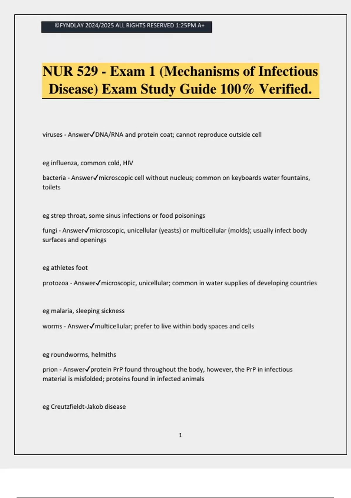 ©FYNDLAY 2024/2025 ALL RIGHTS RESERVED 1:25PM A+ 1 NUR 529 - Exam 1 (Mechanisms of Infectious Disease) Exam Study Guide 100% Verified. viruses - AnswerDNA/RNA and protein coat; cannot reproduce outside cell eg influenza, common cold, HIV bacteria - Answermicroscopic cell without nucleus; common on keyboards water fountains, toilets eg strep throat, some sinus infections or food poisonings fungi - Answermicroscopic, unicellular (yeasts) or multicellular (molds); usually infect body surfaces and openings eg athletes foot protozoa - Answermicroscopic, unicellular; common in water supplies of developing countries eg malaria, sleeping sickness worms - Answermulticellular; prefer to live within body spaces and cells eg roundworms, helmiths prion - Answerprotein PrP found throughout the body, however, the PrP in infectious material is misfolded; proteins found in infected animals eg Creutzfieldt-Jakob disease