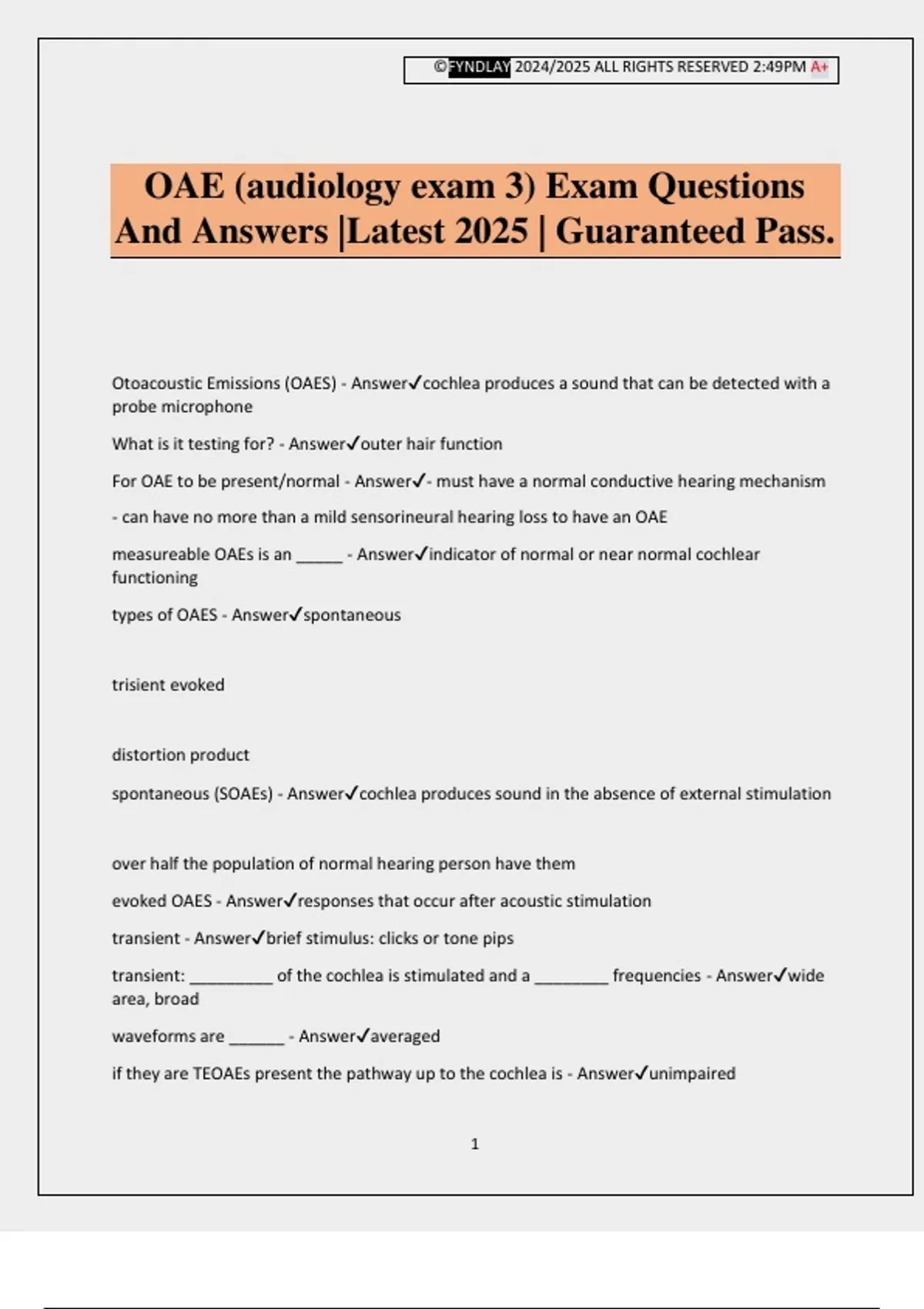 OAE (audiology exam 3) Exam Questions And Answers |Latest 2025 | Guaranteed Pass.