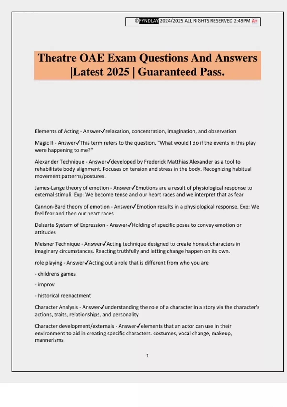 ©FYNDLAY 2024/2025 ALL RIGHTS RESERVED 2:49PM A+ 1 Theatre OAE Exam Questions And Answers |Latest 2025 | Guaranteed Pass. Elements of Acting - Answerrelaxation, concentration, imagination, and observation Magic If - AnswerThis term refers to the question, "What would I do if the events in this play were happening to me?" Alexander Technique - Answerdeveloped by Frederick Matthias Alexander as a tool to rehabilitate body alignment. Focuses on tension and stress in the body. Recognizing habitual movement patterns/postures. James-Lange theory of emotion - AnswerEmotions are a result of physiological response to external stimuli. Exp: We become tense and our heart races and we interpret that as fear Cannon-Bard theory of emotion - AnswerEmotion results in a physiological response. Exp: We feel fear and then our heart races Delsarte System of Expression - AnswerHolding of specific poses to convey emotion or attitudes Meisner Technique - AnswerActing technique designed to create honest characters in imaginary circumstances. Reacting truthfully and letting change happen on its own. role playing - AnswerActing out a role that is different from who you are - childrens games - improv - historical reenactment Character Analysis - Answerunderstanding the role of a character in a story via the character's actions, traits, relationships, and personality Character development/externals - Answerelements that an actor can use in their environment to aid in creating specific characters. costumes, vocal change, makeup, mannerisms ©FYNDLAY 2024/2025 ALL RIGHTS RESERVED 2:49PM A+ 2 Auguste Character Type - Answeran anarchist, a joker, a fool Contra-Auguste Character - AnswerMediator between the whiteface character and the Auguste character Dynamics of Drama - Answerbook by Bernard Beckerman that introduces a new method of script analysis active and reactive segments - Answerfrom the dynamics of drama - scripts are broken into segments crux - AnswerThe most important or decisive point of a script Decrescence - Answerthe change or reaction to the change that was brought by the crux 3 types of objectives - Answerobjective (characters goal), super-objective (goal for the whole play), sub-objective (small changes) Catharsis - AnswerEmotional release denouement - Answerthe final part of a play, movie, or narrative in which the strands of the plot are drawn together and matters are explained or resolved. emotional memory - AnswerThe technique of calling upon your own memories to understand a character's emotions. level - Answerheight of an actor's head onstage Heretical approach to directing - Answerthe directors job is to make the production exciting to the audience history of directing - Answerancient Greece - choregus, the leader of the chorus, directed ancient Roman - organized by a wealthy patron Medieval - "master of secrets" responsible for special effects and directing the keeper of the register was the director, responsible for maintaining the integrity of the script Modern Role of Director - Answerartistic and managerial roles. they must interpret a script, cast actors, design the production, conduct rehearsals, and coordinate everything Neo-Classicism - Ans