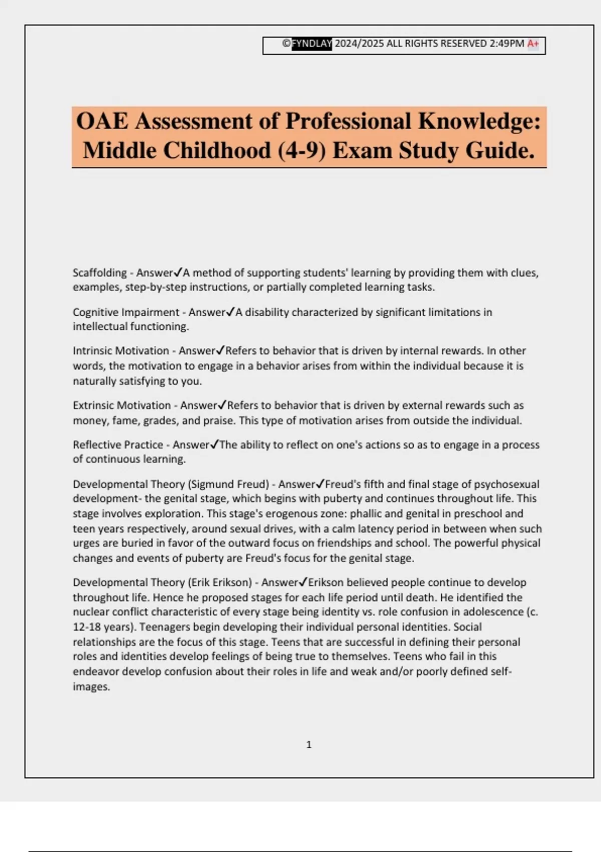 ©FYNDLAY 2024/2025 ALL RIGHTS RESERVED 2:49PM A+ 1 OAE Assessment of Professional Knowledge: Middle Childhood (4-9) Exam Study Guide. Scaffolding - AnswerA method of supporting students' learning by providing them with clues, examples, step-by-step instructions, or partially completed learning tasks. Cognitive Impairment - AnswerA disability characterized by significant limitations in intellectual functioning. Intrinsic Motivation - AnswerRefers to behavior that is driven by internal rewards. In other words, the motivation to engage in a behavior arises from within the individual because it is naturally satisfying to you. Extrinsic Motivation - AnswerRefers to behavior that is driven by external rewards such as money, fame, grades, and praise. This type of motivation arises from outside the individual. Reflective Practice - AnswerThe ability to reflect on one's actions so as to engage in a process of continuous learning. Developmental Theory (Sigmund Freud) - AnswerFreud's fifth and final stage of psychosexual development- the genital stage, which begins with puberty and continues throughout life. This stage involves exploration. This stage's erogenous zone: phallic and genital in preschool and teen years respectively, around sexual drives, with a calm latency period in between when such urges are buried in favor of the outward focus on friendships and school. The powerful physical changes and events of puberty are Freud's focus for the genital stage. Developmental Theory (Erik Erikson) - AnswerErikson believed people continue to develop throughout life. Hence he proposed stages for each life period until death. He identified the nuclear conflict characteristic of every stage being identity vs. role confusion in adolescence (c. 12-18 years). Teenagers begin developing their individual personal identities. Social relationships are the focus of this stage. Teens that are successful in defining their personal roles and identities develop feelings of being true to themselves. Teens who fail in this endeavor develop confusion about their roles in life and weak and/or poorly defined self- images. ©FYNDLAY 2024/2025 ALL RIGHTS RESERVED 2:49PM A+ 2 Social Learning Theory - AnswerAlbert Bandura's social learning theory emphasized the importance of social interaction in learning. Also, he believes learning does not necessarily change behavior. Bandura discovered children learned indirectly by watching others—i.e., vicarious or observational learning: seeing others receiving rewards for certain behaviors, they imitated those actions to obtain similar rewards. This discovery contradicted the empiricist claim that learning requires direct experience. Bandura also discovered children witnessing violent actions by living persons (cf. his Bobo doll experiments) or by people they saw in video recordings would then display more aggressive behaviors imitating what they observed. This influenced education and parenting: adults, realizing children's behavior was influenced not just directly by experiencing violence, but also indirectly by observing it, became more concerned about controlling what children observed. Bandura identified attention, retention, reproduction, and motivation as conditions necessary to modeling and observational learning. Bandura's concept of reciprocal determinism states individuals and environments mutually influence each other. His concept of self-efficacy identifies belief in one's individual competence to perform specific tasks and skills. Jerome Bruner - AnswerBruner, like Piaget and many others, embraces constructivist philosopher, i.e., by interacting with their environments, children actively construct their learning, knowledge, and realities. His emphasis on discovery learning is based on constructivism. He defined learning as not only remembering existing, culturally imparted or acquired ideas and actions, but moreover inventing or creating these on one's own. Bruner feels "culturally invented technologies" amplify human abilities, rather than providing all knowledge. He influenced education by advising that its goal should be producing autonomous learners. Bruner posited three modes of representation in child cognitive development. 1) Enactive representation: action-based information based on motor responses, retained in muscle memory, emerging in infancy. 2) Iconic representation: visual image- based information, emerging around 1-6 years of age. 3) Symbolic representation: coded or symbolic storage of information, emerging c. 7 years and older. Bruner's concept of the spiral curriculum enabled teaching complex ideas to all ages by initially structuring them simply and increasing difficulty gradually. Bruner (with Wood and Ross) originated the concept scaffolding—temporary, gradually withdrawn support matching student needs. John Dewey - AnswerPsychologist, philosopher, educator, and social activist John Dewey was a prominent member of the Progressive social reform movement, a president of the American Psychological Association, a functional psychology pioneer, a Pragmatist and Instrumentalist philosopher, and the foremo