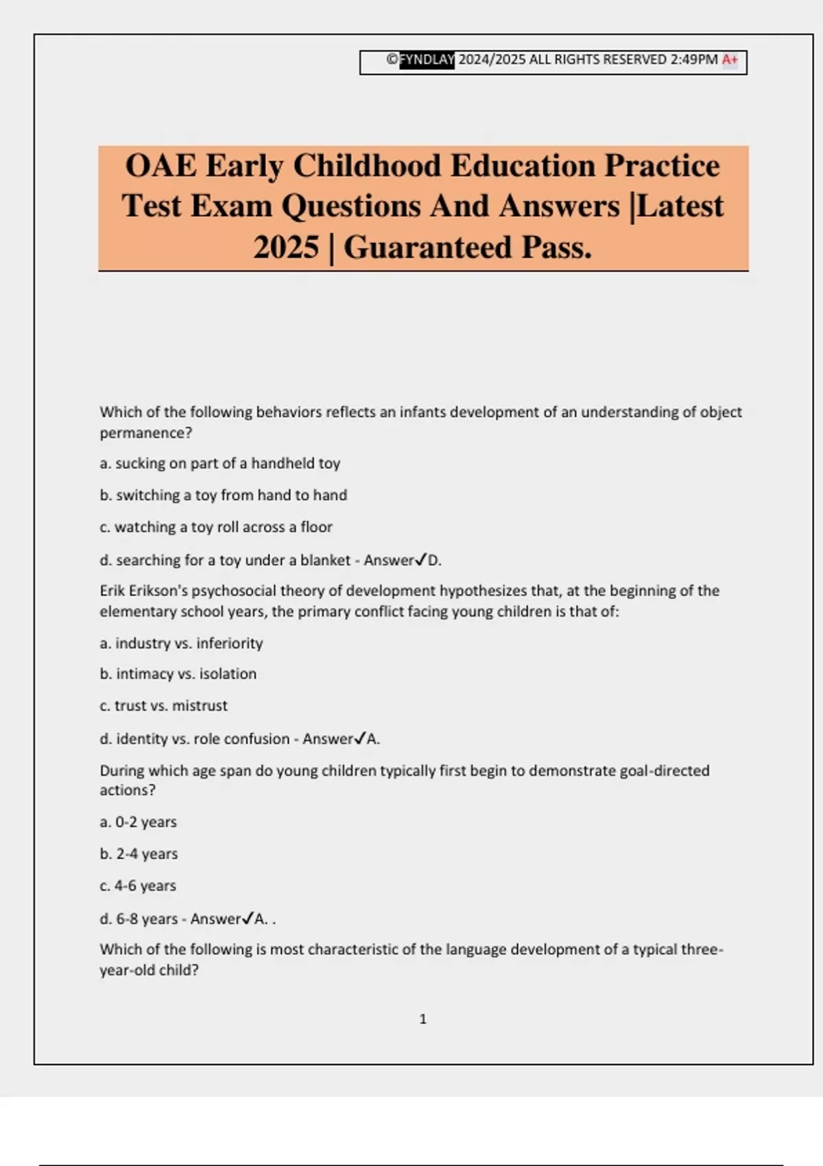 ©FYNDLAY 2024/2025 ALL RIGHTS RESERVED 2:49PM A+ 1 OAE Early Childhood Education Practice Test Exam Questions And Answers |Latest 2025 | Guaranteed Pass. Which of the following behaviors reflects an infants development of an understanding of object permanence? a. sucking on part of a handheld toy b. switching a toy from hand to hand c. watching a toy roll across a floor d. searching for a toy under a blanket - AnswerD. Erik Erikson's psychosocial theory of development hypothesizes that, at the beginning of the elementary school years, the primary conflict facing young children is that of: a. industry vs. inferiority b. intimacy vs. isolation c. trust vs. mistrust d. identity vs. role confusion - AnswerA. During which age span do young children typically first begin to demonstrate goal-directed actions? a. 0-2 years b. 2-4 years c. 4-6 years d. 6-8 years - AnswerA. . Which of the following is most characteristic of the language development of a typical three- year-old child? ©FYNDLAY 2024/2025 ALL RIGHTS RESERVED 2:49PM A+ 2 a. speaking in complete simple sentences (e.g. "I want a cookie." b. pointing to objects and uttering a single word (e.g. "Cookie") c. combining two words together (e.g. "Want cookie") d. speaking in complex sentences (e.g. "Please give me a chocolate cookies because I feel very very hungry" - AnswerA. Which of the following is most important to address is a health and safety unit for kindergarteners as they being the school year? a. Reasons for respecting the safety rules established by teachers, administrators, and other adults b. Common causes of minor injuries that occur on the school playground c. The different ways in which harmful household substances affect the body is ingested and touched d. Procedures for crossing streets, parking lots, and driveways and bus safety - AnswerD. A preschool teacher observes two three-year-olds playing silently side by side in a sandbox, each building a castle. Which of the following would be the most appropriate conclusion for the teacher to draw in regard to this behavior? a. The children's play is advanced for their age and suggests that they may be gifted learners b. The children's play falls within the developmentally appropriate range for preschoolers. c. The children's play seems overly static and in need of intervention to stimulate greater creativity d. The children's play is typical of much younger children and suggests significant developmental delays - AnswerB. Which of the following types of peer relationships is most characteristic of second-grade students? a. A single-exclusive friendship b. Small, same-gender groups c. Popularity-based cliques d. Fluid, heterogeneous gangs - AnswerB. The curriculum in an early childhood program encourages young children to become engaged in challenging activities that involve both planning and problem solving. This aspect of the curriculum is most likely to promote the children's ability to: a. Adjust easily to unexpected changes in the daily schedule ©FYNDLAY 2024/2025 ALL RIGHTS RESERVED 2:49PM A+ 3 b. Perform in the highest percentile on mandated tests c. Approach new learning experiences with confidence d. Maintain focus and concentration during academic instruction - AnswerC. Which of the following would be the most effective method to use for monitoring the progress of second-grade students in mathematics? a. Administering a norm-referenced assessment midway through the school year b. Conducting frequent curriculum-based assessments c. Administering a dynamic skills assessment at the beginning of each instructional unit d. Conducting a portfolio assessment at the end of the school year - AnswerB. Which of the following reflects the best use of a developmental screening checklist with preschool children? a. To create a profile of children's individual learning styles b. To determine whether individual children are eligible for special education services c. To identify children who are in need of more in-depth assessment in specific areas d. To modify instructional strategies for children with developmental delays - AnswerC. Which of the following assessment adaptations would be the most appropriate to use with a first-grade English language learner? a. Using a standardize test with multiple subtests b. Presenting material nonverbally c. Beginning the test at a lower age level d. Using culturally relevant materials - AnswerD. Which of the following assessment strategies would provide a kindergarten teacher with the most comprehensive information about a student's oral language development? a. Observing the student during conversations with peers b. Asking the student several questions that require yes or no responses c. Listening to the student recite the alphabet d. Having the student read a list of sight words aloud - AnswerA. Which of the following is the most appropriate rationale for a team approach when assessing young children? ©FYNDLAY 2024/2025 ALL RIGHTS RESERVED 2:49PM A+ 4 a. Coordination of assessment results from a variety of disciplines increased the effectiveness of instruction b. Collaboration is an effective time-management strategy to complete evaluations quickly c. Coordination of evaluations helps eliminate the need to recommend more in-depth assessment d. Collaboration among professional helps parents feel confident about the reliability of the assessment results - AnswerA. A first-grade teacher is participating in an initial special education evaluation of a student in the teacher's class. In addition to documenting the student's current level of academic performance, the teacher would typically provide which of the following information to the evaluation team? a. Plans to involve the family in the student's instructional program at home b. Documentation of the student's complete developmental and medical history c. Plans to implement a new instructional strategy with the student d. Documentation of the strategies and modifications to instruction th