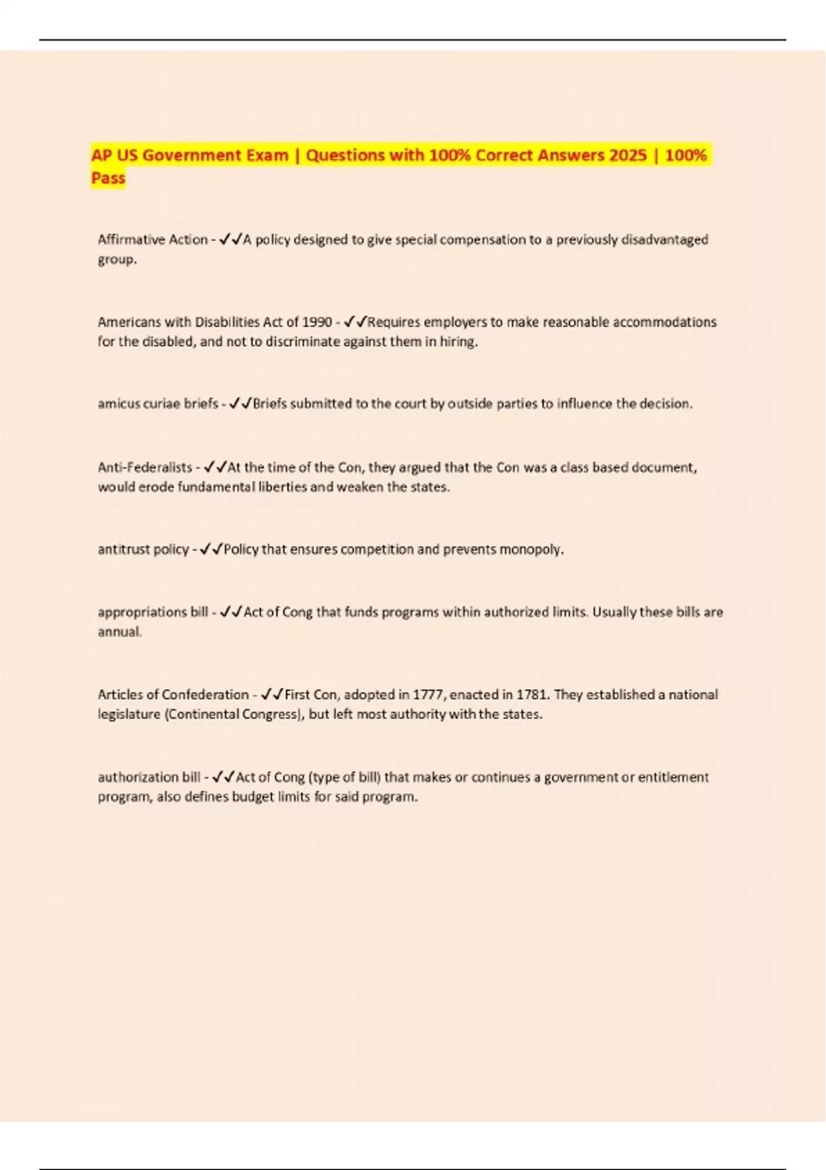 AP US Government Exam | Questions with 100% Correct Answers 2025 | 100% Pass