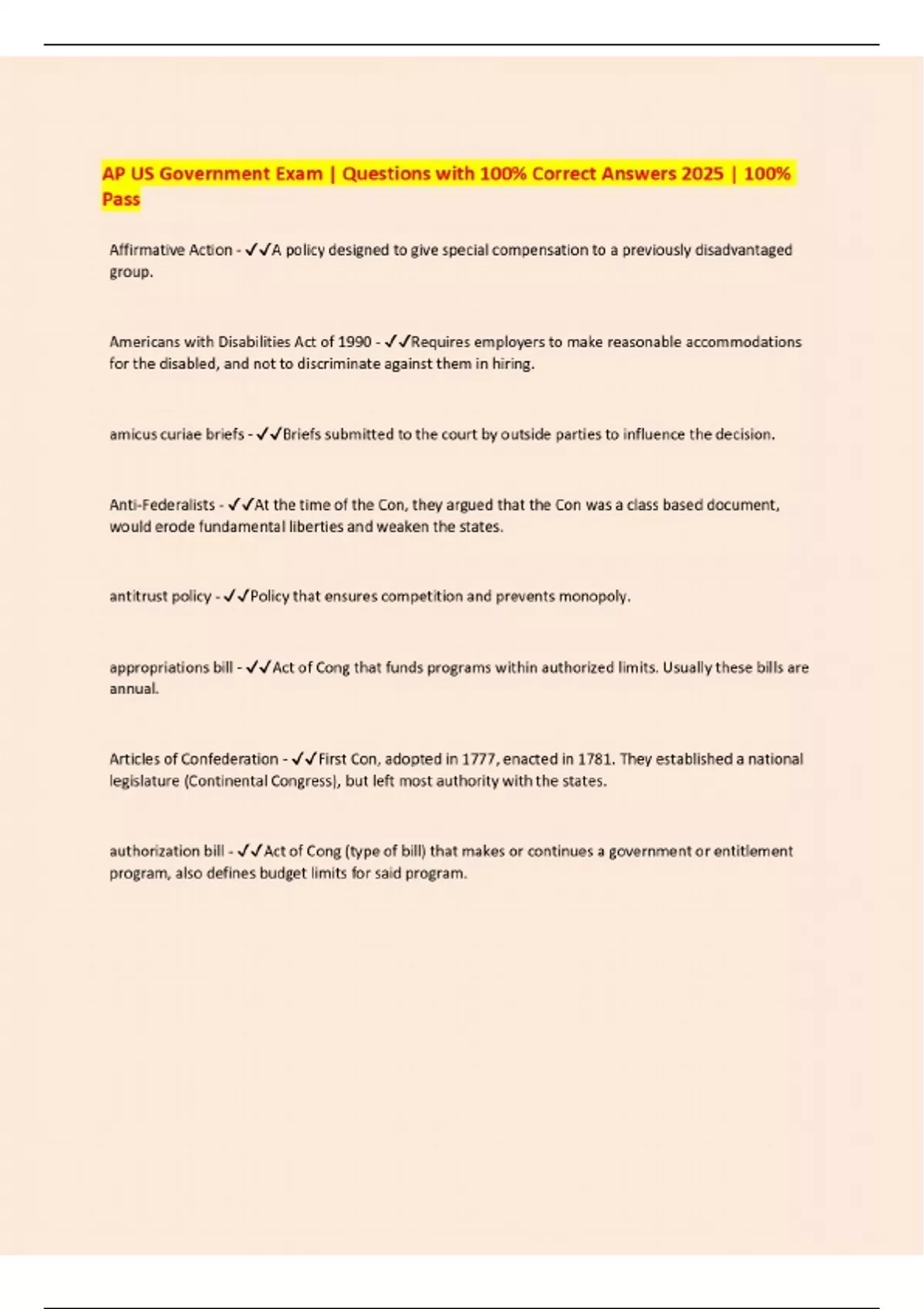 AP US Government Exam | Questions with 100% Correct Answers 2025 | 100% Pass