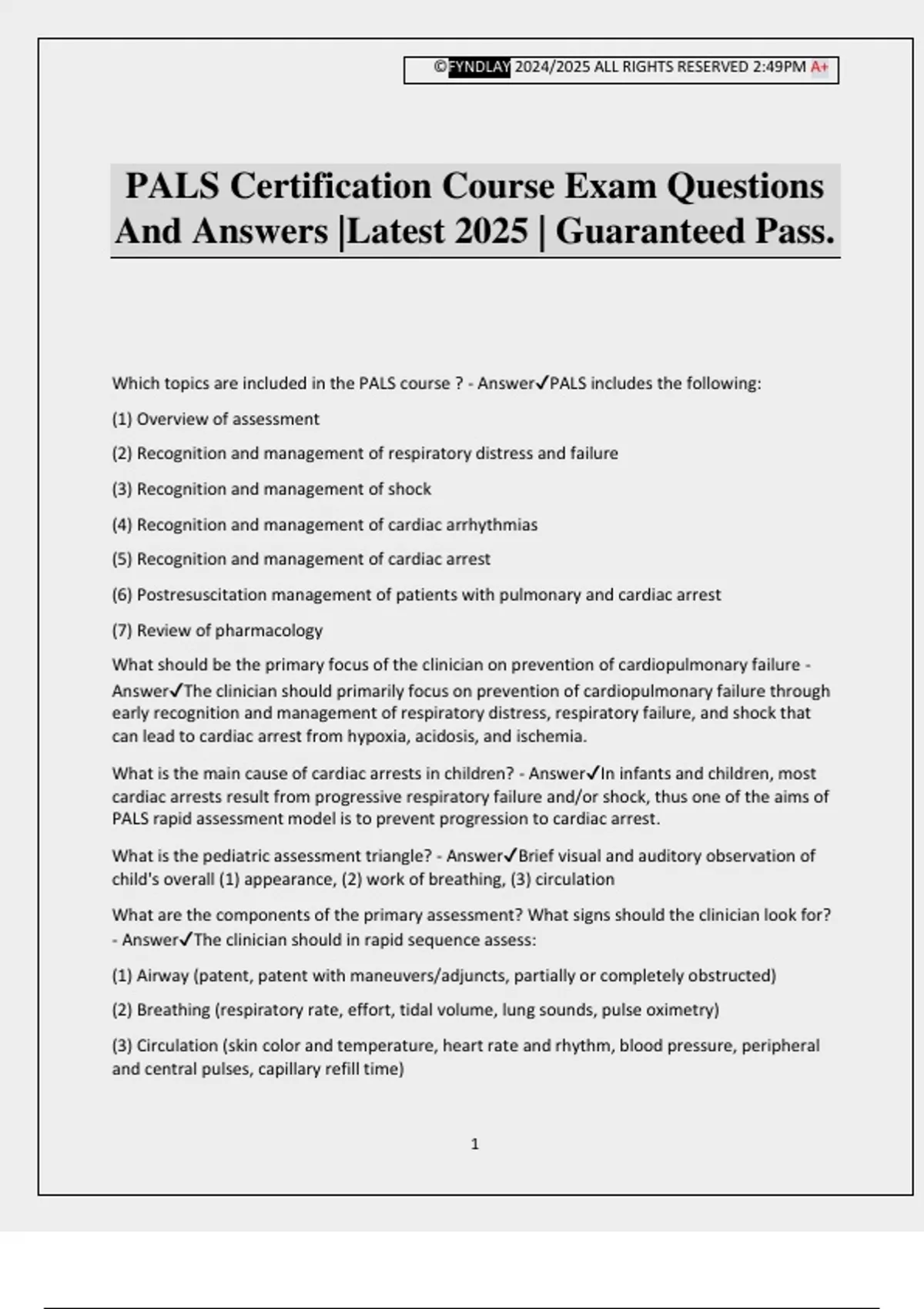 ©FYNDLAY 2024/2025 ALL RIGHTS RESERVED 2:49PM A+ 1 PALS Certification Course Exam Questions And Answers |Latest 2025 | Guaranteed Pass. Which topics are included in the PALS course ? - AnswerPALS includes the following: (1) Overview of assessment (2) Recognition and management of respiratory distress and failure (3) Recognition and management of shock (4) Recognition and management of cardiac arrhythmias (5) Recognition and management of cardiac arrest (6) Postresuscitation management of patients with pulmonary and cardiac arrest (7) Review of pharmacology What should be the primary focus of the clinician on prevention of cardiopulmonary failure - AnswerThe clinician should primarily focus on prevention of cardiopulmonary failure through early recognition and management of respiratory distress, respiratory failure, and shock that can lead to cardiac arrest from hypoxia, acidosis, and ischemia. What is the main cause of cardiac arrests in children? - AnswerIn infants and children, most cardiac arrests result from progressive respiratory failure and/or shock, thus one of the aims of PALS rapid assessment model is to prevent progression to cardiac arrest. What is the pediatric assessment triangle? - AnswerBrief visual and auditory observation of child's overall (1) appearance, (2) work of breathing, (3) circulation What are the components of the primary assessment? What signs should the clinician look for? - AnswerThe clinician should in rapid sequence assess: (1) Airway (patent, patent with maneuvers/adjuncts, partially or completely obstructed) (2) Breathing (respiratory rate, effort, tidal volume, lung sounds, pulse oximetry) (3) Circulation (skin color and temperature, heart rate and rhythm, blood pressure, peripheral and central pulses, capillary refill time) ©FYNDLAY 2024/2025 ALL RIGHTS RESERVED 2:49PM A+ 2 (4) Disability: (a)AVPU pediatric response scale: Alert, Voice, Pain, Unresponsive; (b) Pupillary response to light (c) Presence of hypoglycemia (rapid bedside glucose or response to empiric administration of dextrose) (d) Glasgow Coma Scale What are the components of the secondary assessment? For what should the clinician look for during the secondary assessment? - AnswerThis portion of the evaluation includes a thorough head to toe physical examination, as well as a focused medical history that consists of the "SAMPLE" history: (S) Signs and Symptoms (A) Allergies (M) Medications (P) Past medical history (L) Last meal (E) Events leading to current illness What are the components of the tertiary assessment? - AnswerInjury and infection are common causes of life-threatening illness in children. Thus, for this stage, ancillary studies are frequently directed towards identifying the extent of trauma or an infectious focus. There are many causes of acute respiratory compromise in children. The clinician should strive to categorize respiratory distress or failure into one or more of the following: - Answer(1) Upper airway obstruction (eg, croup, epiglottitis) (2) Lower airway obstruction (eg, bronchiolitis, status asthmaticus) (3) Lung tissue (parenchymal) disease (eg, bronchopneumonia) (4) Disordered control of breathing (eg, seizure, coma, muscle weakness) What is the focus of initial management - AnswerThe main focus of initial management is to support airway, breathing, and circulation How can the clinician support the airway? - Answer(1) Provide 100 percent inspired oxygen (2) Allow child to assume position of comfort or manually open airway (3) Clear airway (suction) (4) Insert an airway adjunct if consciousness is impaired (eg, nasopharyngeal airway or, if gag reflex absent, oropharyngeal airway)