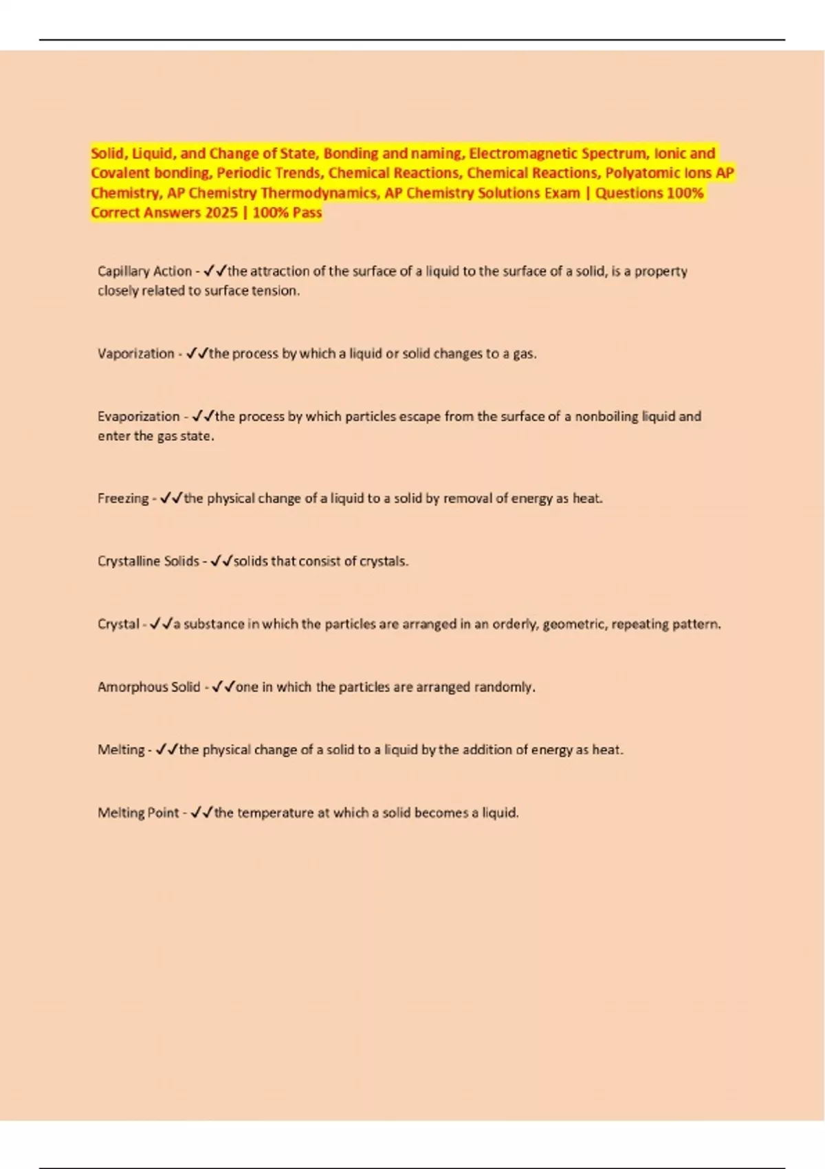 Solid, Liquid, and Change of State, Bonding and naming, Electromagnetic Spectrum, Ionic and Covalent bonding, Periodic Trends, Chemical Reactions, Chemical Reactions, Polyatomic Ions AP Chemistry, AP Chemistry Thermodynamics, AP Chemistry Solutions Exam | Questions 100% Correct Answers 2025 | 100% Pass