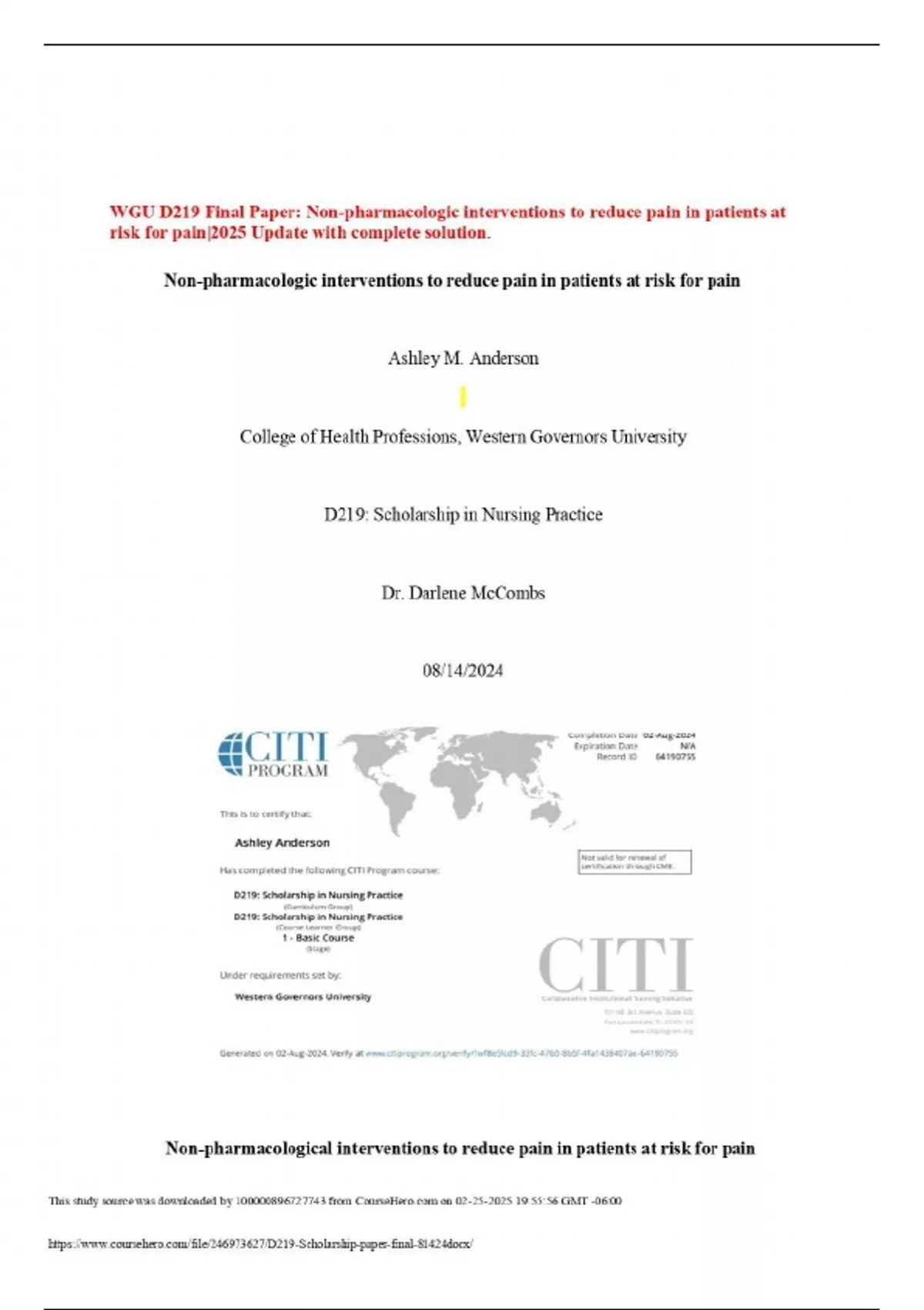 WGU D219 Final Paper: Non-pharmacologic interventions to reduce pain in patients at risk for pain|2025 Update with complete solution.