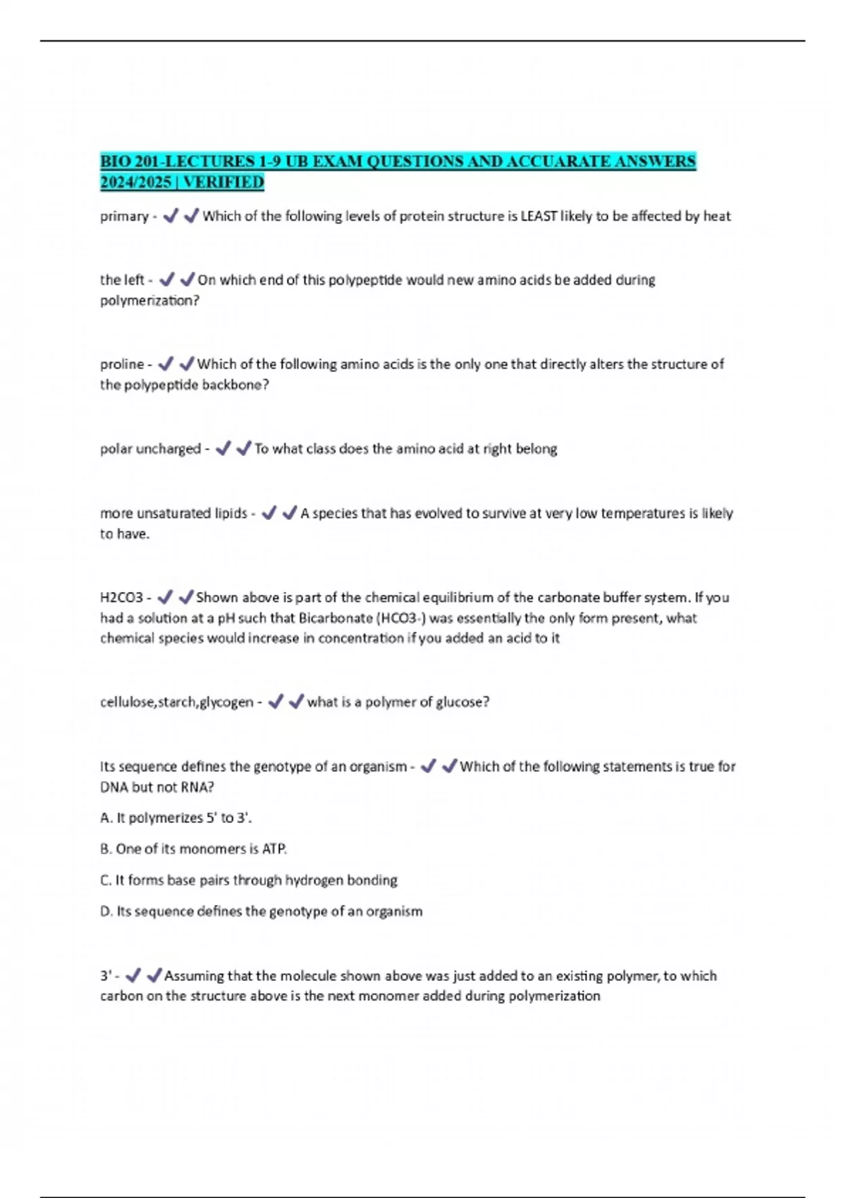 bioc 201 exam questions and 100 correct answers