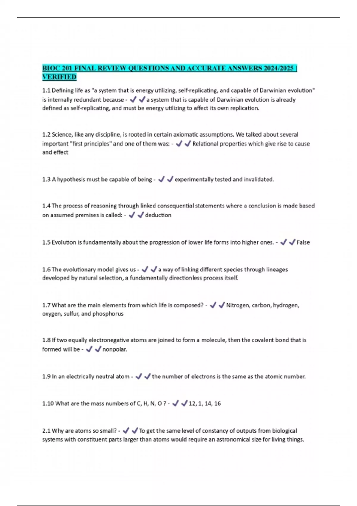 bioc 201 exam questions and 100 correct answers
