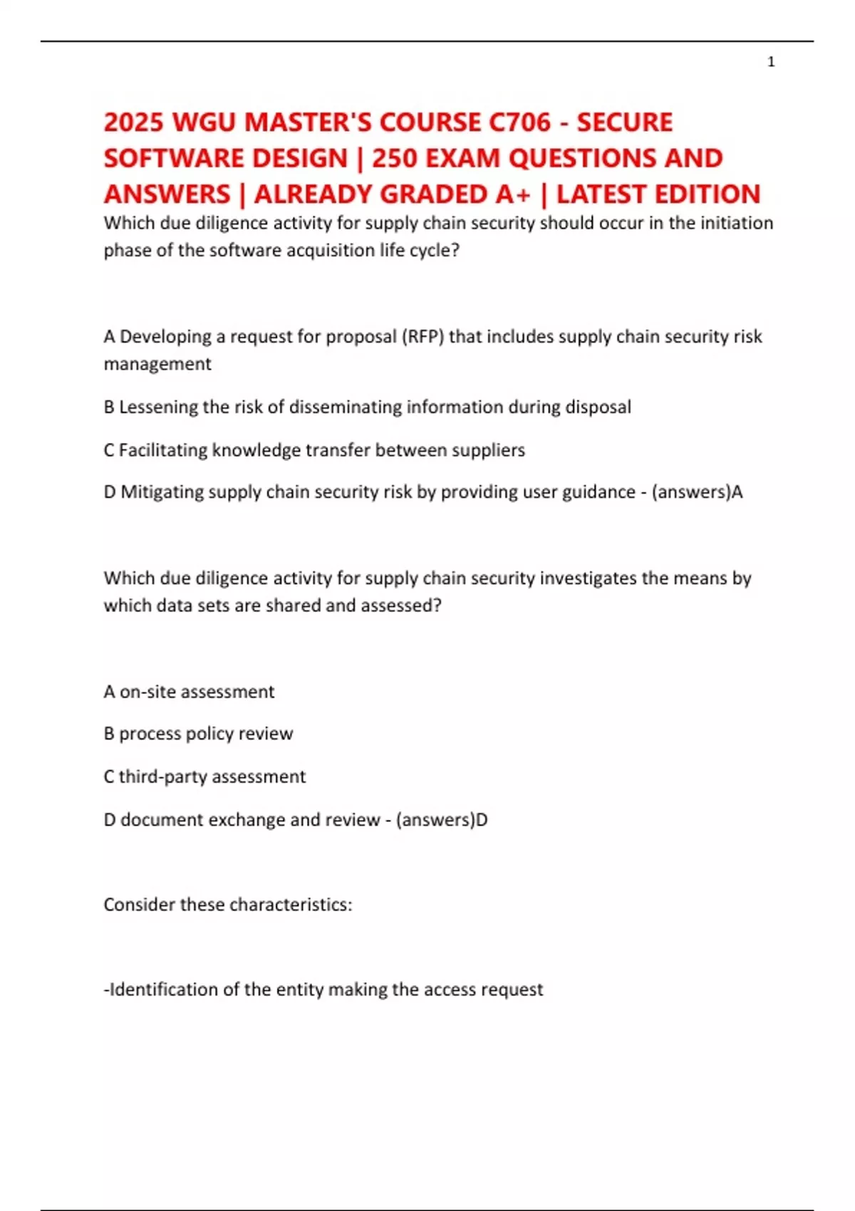 2025 WGU MASTER'S COURSE C706 - SECURE SOFTWARE DESIGN | 250 EXAM QUESTIONS AND ANSWERS | ALREADY GRADED A+ | LATEST EDITION