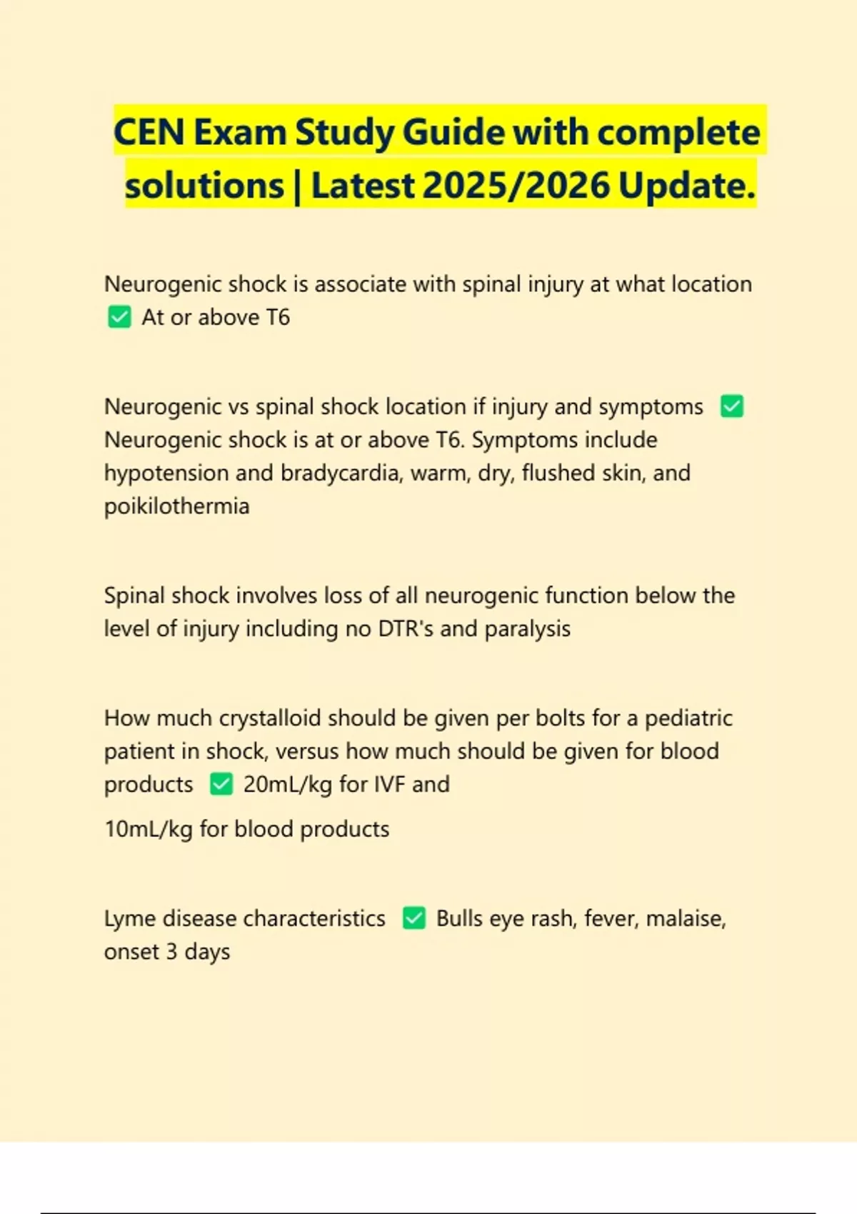 Neurogenic shock is associate with spinal injury at what location At or above T6 Neurogenic vs spinal shock location if injury and symptoms Neurogenic shock is at or above T6. Symptoms include hypotension and bradycardia, warm, dry, flushed skin, and poikilothermia Spinal shock involves loss of all neurogenic function below the level of injury including no DTR's and paralysis How much crystalloid should be given per bolts for a pediatric patient in shock, versus how much should be given for blood products 20mL/kg for IVF and 10mL/kg for blood products Lyme disease characteristics Bulls eye rash, fever, malaise, onset 3 days Rocky Mountain spotted fever characteristics Sudden onset fever, petechial rash to extremities and progresses to pink macular rash on palms, wrists, soles, ankles, onset 14 days How are rick borne illnesses managed? A. Antibiotic treatment with amoxicillin for 5 days B. Antibiotic treatment with erythromycin for 7-10 days C. There is no treatment for the disease D. Antibiotic treatment with doxycycline or amoxicilllin for 2-3 weeks D. Antibiotic treatment with doxycycline or amoxicilllin for 2-3 weeks A boy arrives to the ED stating he was bitten on the foot while playing outside. He is screaming with pain at the bite mark, nauseated and weak. He describes severe abdominal pain and spasms in his leg. You suspect he has been bitten by a A. Tick B. Black widow spider C. Wasp D. Brown recluse spider B. Black widow spiders inject a neurotoxin and cause immediate pain After load is low in what type of shock Distributive, for example massive PE, cardiac tamponade, abdominal compartment syndrome Preload is measured by CVP, which is right atrial pressure CEN Exam Study Guide with complete solutions | Latest 2025/2026 Update.