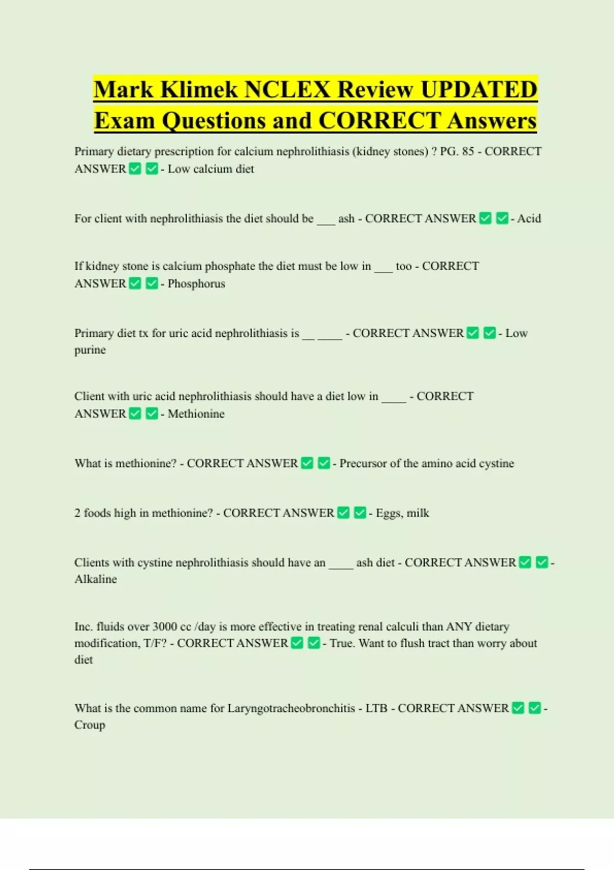 For client with nephrolithiasis the diet should be ___ ash - CORRECT ANSWER - Acid