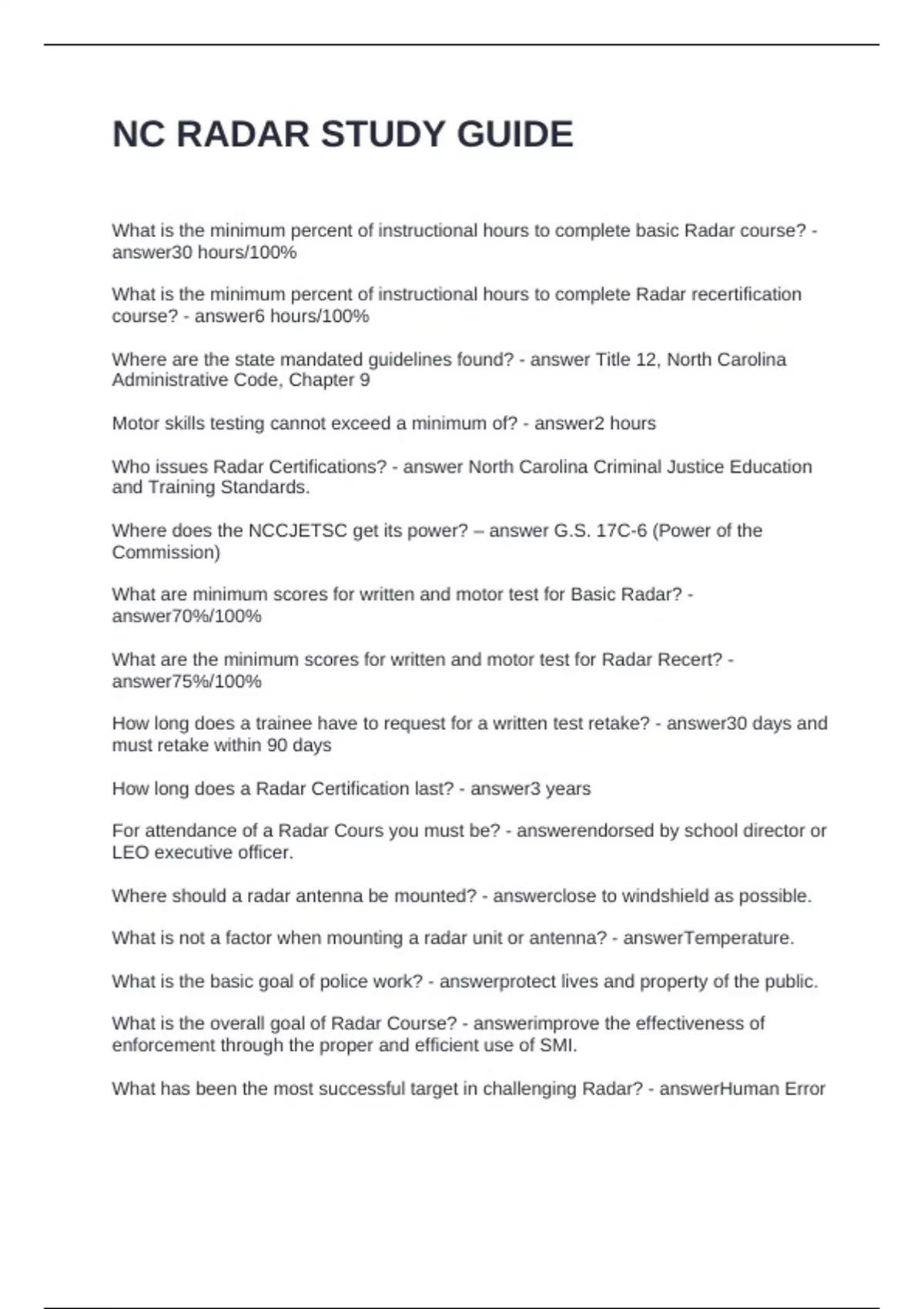 NC RADAR STUDY GUIDE QUESTIONS AND ANSWERS GRADED A+
