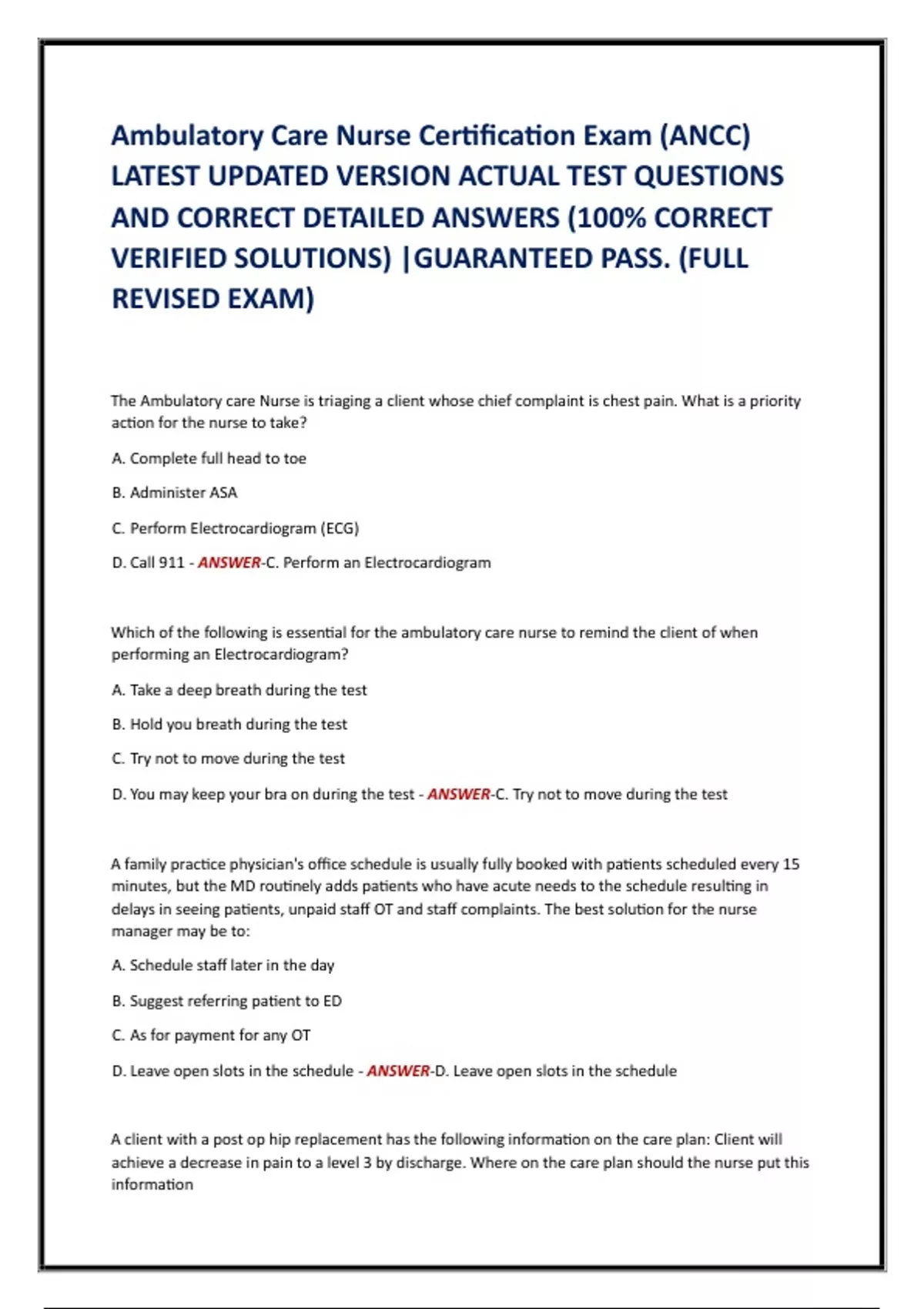 Ambulatory Care Nurse Certification Exam (ANCC) LATEST UPDATED VERSION ACTUAL TEST QUESTIONS AND CORRECT DETAILED ANSWERS (100% CORRECT VERIFIED SOLUTIONS) |GUARANTEED PASS. (FULL REVISED EXAM) Ambulatory Care Nurse Certification Exam (ANCC) LATEST UPDATED VERSION ACTUAL TEST QUESTIONS AND CORRECT DETAILED ANSWERS (100% CORRECT VERIFIED SOLUTIONS) |GUARANTEED PASS. (FULL REVISED EXAM)
