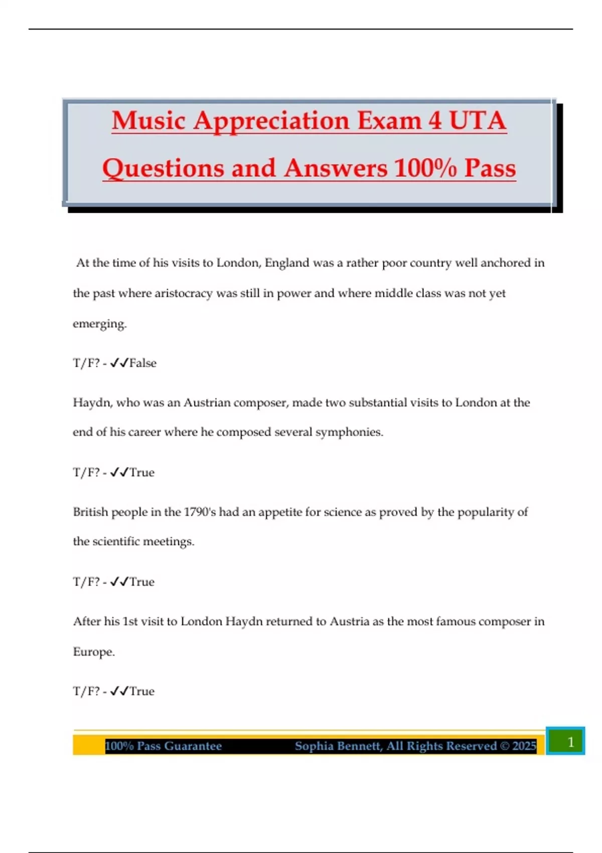 Music Appreciation Exam 4 UTA Questions and Answers 100% Pass At the time of his visits to London, England was a rather poor country well anchored in the past where aristocracy was still in power and where middle class was not yet emerging. T/F? - False Haydn, who was an Austrian composer, made two substantial visits to London at the end of his career where he composed several symphonies. T/F? - True British people in the 1790's had an appetite for science as proved by the popularity of the scientific meetings. T/F? - True After his 1st visit to London Haydn returned to Austria as the most famous composer in Europe. T/F? - True 2100% Pass Guarantee Sophia Bennett, All Rights Reserved © 2025 Haydn found in London a new type of pianos that were not used in continental Europe, which offered more sound to the performer. T/F? - True In 1781 Mozart left Salzburg and his father, and moved to Vienna. T/F? - True After moving to Vienna, Mozart's relation with his father improved dramatically. T/F? - False Mozart's father worked as: A. Merchant in Vienna B. Painter at the court of Salzburg C. Musician at the court of Salzburg D. Writer in Austria - C. Musician at the court of Salzburg Mozart gave concerts as a child with his sister who was also an accomplished keyboard player. T/F? - True Once that Mozart moved to Vienna he had for a while a lavish life of pleasure and luxury. 3100% Pass Guarantee Sophia Bennett, All Rights Reserved © 2025 T/F? - True Mozart married Constanze Weber with the blessings of his father. T/F? - False When Mozart was still a child his father: A. Took him on a concert tour alone. B. Took him on a concert tour with the whole family
