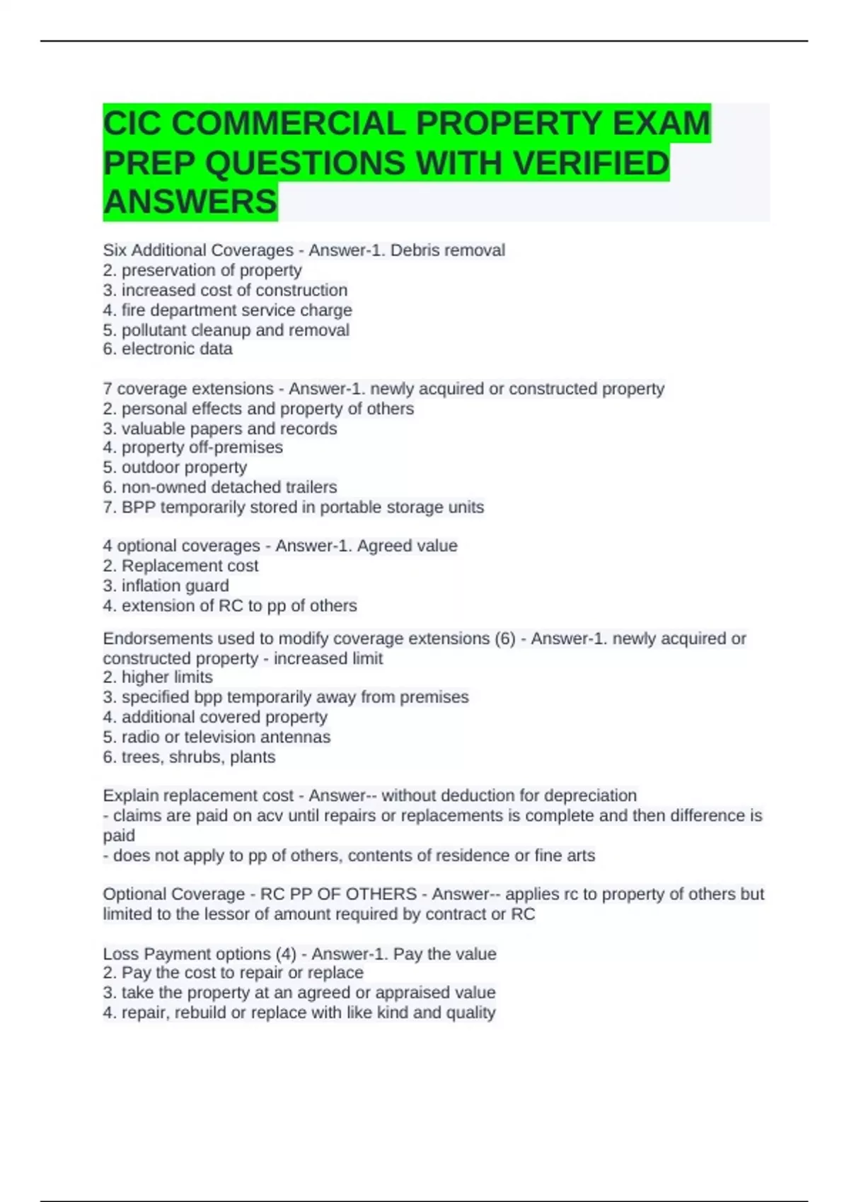 CIC COMMERCIAL PROPERTY EXAM PREP QUESTIONS WITH VERIFIED ANSWERS