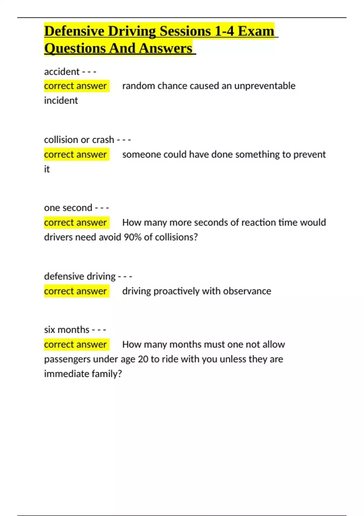, Defensive Driving Sessions 1-4 Exam
