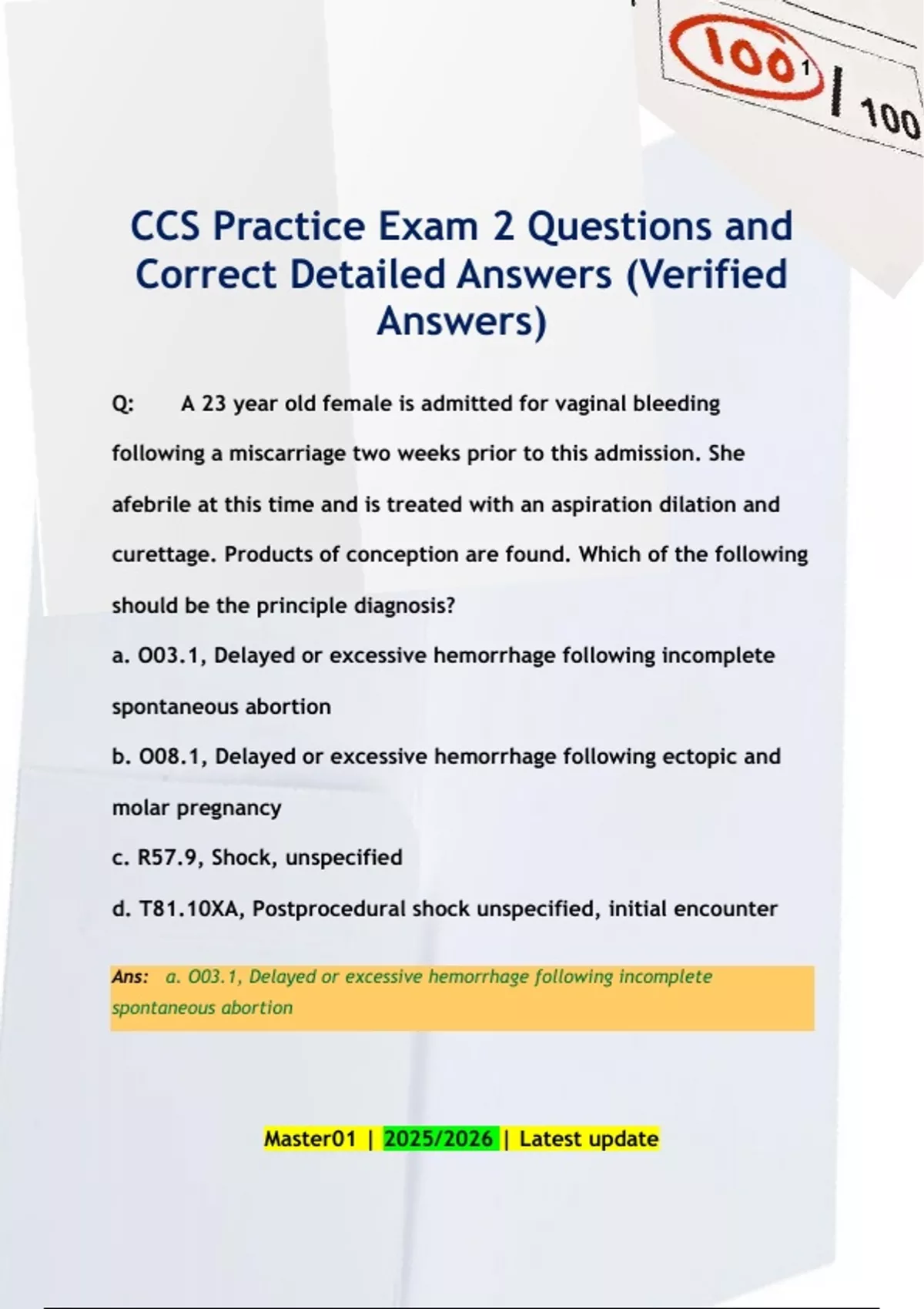 Q: A 23 year old female is admitted for vaginal bleeding following a miscarriage two weeks prior to this admission. She afebrile at this time and is treated with an aspiration dilation and curettage. Products of conception are found. Which of the following should be the principle diagnosis? a. O03.1, Delayed or excessive hemorrhage following incomplete spontaneous abortion b. O08.1, Delayed or excessive hemorrhage following ectopic and molar pregnancy c. R57.9, Shock, unspecified d. T81.10XA, Postprocedural shock unspecified, initial encounter Ans: a. O03.1, Delayed or excessive hemorrhage following incomplete spontaneous abortion 2 Master01 | 2025/2026 | Latest update Q: A psychiatrist documents that a patient has wide mood swings from excessive happiness to loss of energy and crying. What condition is suspected? a. Bipolar disorder b. Major depression c. Anxiety d. Psychosis Ans: A. Bipolar disorder Q: A patient with a cephalic presentation anticipating a vaginal delivery failed to progress. After measurement of the fetal head and a trial of oxytocin, the patient underwent a cesarean section. What condition should the coder suspect and query the physician about? a. Twin pregnancy b. Early delivery c. Eclampsia d. Cephalopelvic disproportion Ans: d. Cephalopelvic disproportion 3 Master01 | 2025/2026 | Latest update Q: A 45 year old woman underwent a carotid bypass and experienced a significant drop in blood pressure during the surgery. The documentation suggested the patient may have had a myocardial infarction. In accordance with coding guidelines, what should the coder do? a. Code complication of surgery NOS. b. Query the physician to determine if the patient had hypotension. c. Query the physician to determine if there was a complication of surgery. d. Code preoperative shock. Ans: c. Query the physician to determine if there was a complication of surgery. Q: If a patient's discharge summary does not contain a diagnosis that is documented by the anesthesiologist in a preoperative evaluation and that would impact MS-DRG assignment, the coder should: a. Code only from the discharge diagnosis b. Code the diagnosis reflected on the anesthesia preoperative evaluation 4 Master01 | 2025/2026 | Latest update c. Code the most severe symptom d. Query the attending physician regarding the clinical significance of that diagnosis Ans: d. Query the attending physician regarding the clinical significance of that diagnosis