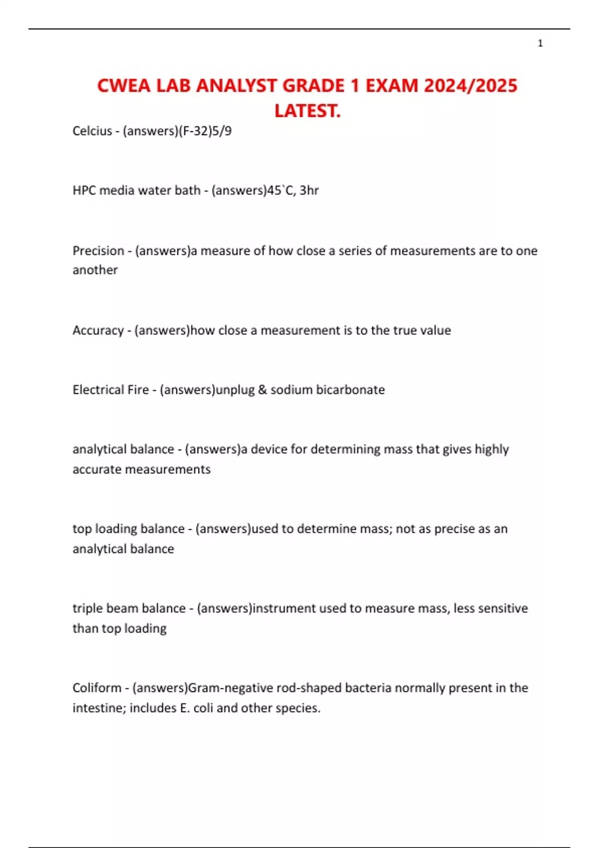 CWEA LAB ANALYST GRADE 1 EXAM 2024/2025 LATEST.