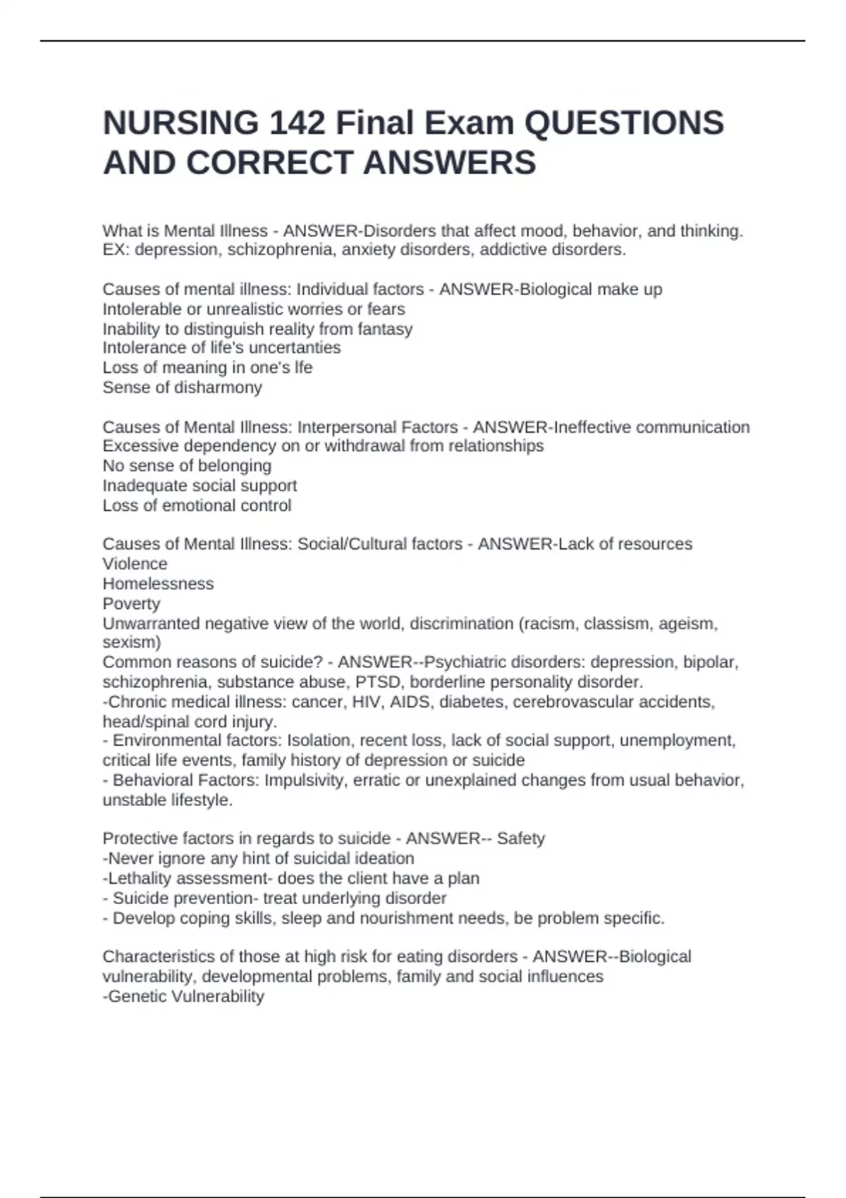 Causes of Mental Illness: Social/Cultural factors - ANSWER-Lack of resources