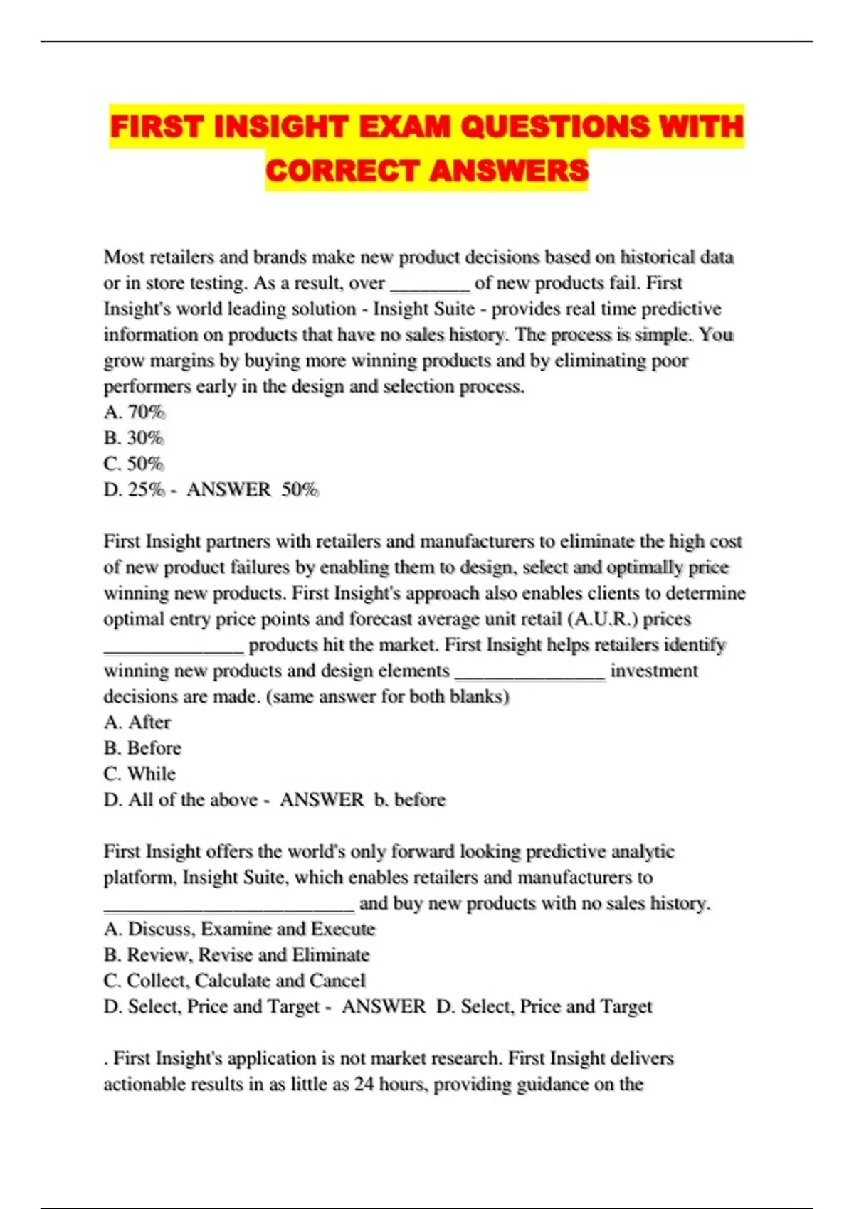 FIRST INSIGHT EXAM QUESTIONS WITH