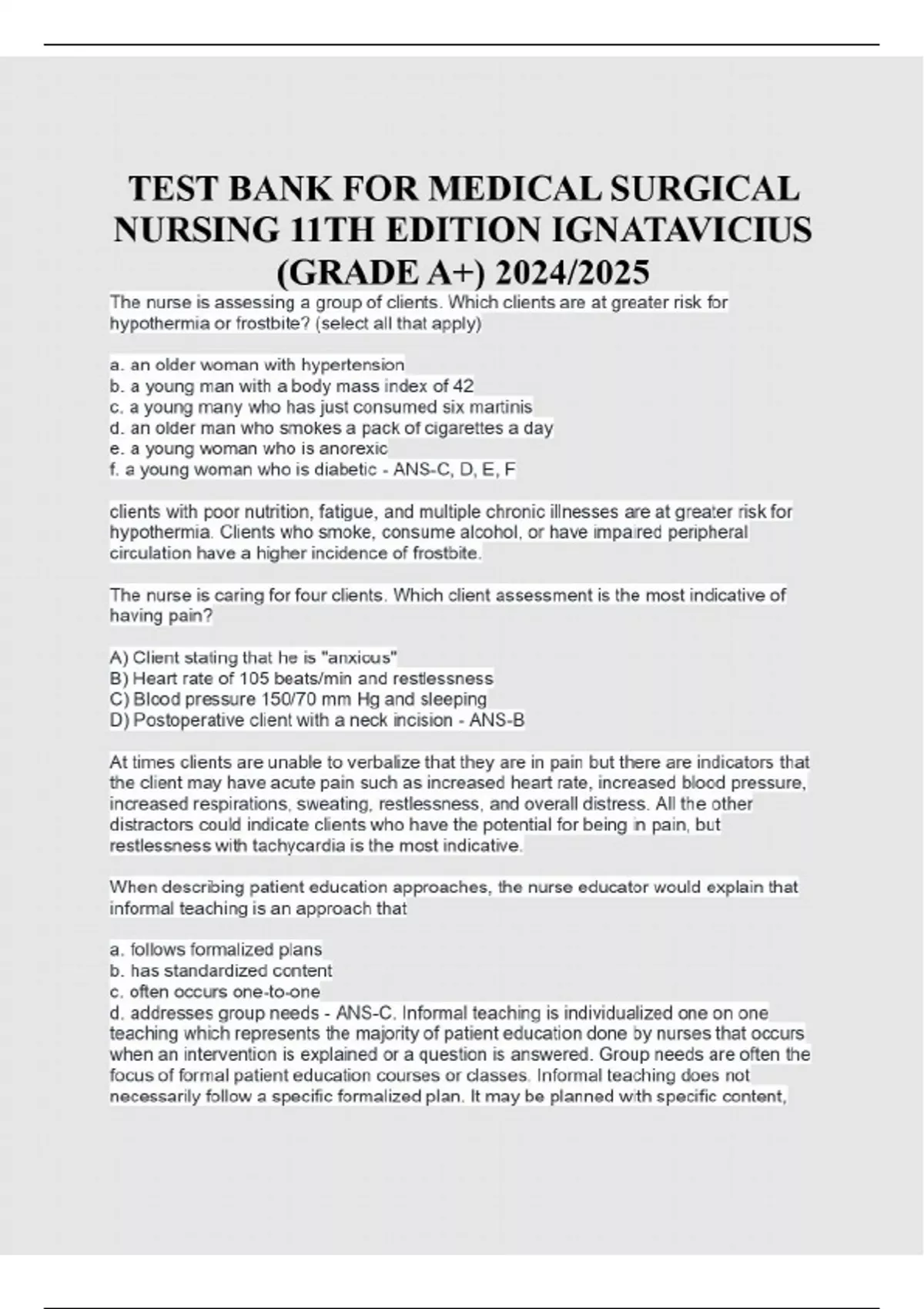 TEST BANK FOR MEDICAL SURGICAL NURSING 11TH EDITION IGNATAVICIUS (GRADE A+) 2024/2025 The nurse is assessing a group of clients. Which clients are at greater risk for hypothermia or frostbite? (select all that apply) a. an older woman with hypertension b. a young man with a body mass index of 42 c. a young many who has just consumed six martinis d. an older man who smokes a pack of cigarettes a day e. a young woman who is anorexic f. a young woman who is diabetic - ANS-C, D, E, F clients with poor nutrition, fatigue, and multiple chronic illnesses are at greater risk for hypothermia. Clients who smoke, consume alcohol, or have impaired peripheral circulation have a higher incidence of frostbite. The nurse is caring for four clients. Which client assessment is the most indicative of having pain? A) Client stating that he is "anxious" B) Heart rate of 105 beats/min and restlessness C) Blood pressure 150/70 mm Hg and sleeping D) Postoperative client with a neck incision - ANS-B At times clients are unable to verbalize that they are in pain but there are indicators that the client may have acute pain such as increased heart rate, increased blood pressure, increased respirations, sweating, restlessness, and overall distress. All the other distractors could indicate clients who have the potential for being in pain, but restlessness with tachycardia is the most indicative. When describing patient education approaches, the nurse educator would explain that informal teaching is an approach that a. follows formalized plans b. has standardized content c. often occurs one-to-one d. addresses group needs - ANS-C. Informal teaching is individualized one on one teaching which represents the majority of patient education done by nurses that occurs when an intervention is explained or a question is answered. Group needs are often the focus of formal patient education courses or classes. Informal teaching does not necessarily follow a specific formalized plan. It may be planned with specific content, but it is individualized responses to patient needs. Formal teaching involves the use of a curriculum/course plan with standardized content. A patient expresses a strong interest in returning to their work, family, and hobbies after having a stroke. Which theory type would the nurse use to develop a plan of care for the best results of this patient's motivation style? a. field b. biological c. cognitive d. sociologic - ANS-C. Cognitive theorists believe that attention, relevance, confidence, and satisfaction (ARCS) are the conditions that, when integrated, motivate someone to learn. Field theorists place significance on how achievement, power, the need for affiliation, and avoidance motives influence individual behavior. Sociologic theories are not involved in motivation. Which statement made by a nurse represents the need for further education regarding pain management in older adult clients? a. older adults tend to report pain less often than younger adults b. older clients usually have more experience with pain than younger clients c. older adults are at greatest risk for under treated pain d. older clients have a different pain mechanism and do not feel it as much - ANS-D There is no evidence to support the idea that older adult clients perceive pain any differently than younger clients. The other statements are accurate regarding older clients and pain. The nurse is working at a first aid booth for a spring training game on a hot day. A spectator comes in, reporting that he is not feeling well. Vital signs are temp 104.1 F, pulse 132 BPM, respires 26 breaths/min, and blood pressure 106/66 mm Hg. He trips over his feet as the nurse leads him to a cot. What is the priory action of the nurse? a. admin Tylenol 650 mg orally b. encourage rest, and reassess in 15 minutes c. sponges the victim with cool water and remove his shirt d. encourages drinking of cool water or sports drink - ANS-C The spectator shows signs of heat stroke, which is a medical emergency. The spectator should be transported to the ED ASAP. The nurse should take actions to lower his body temp in the meantime by removing his shirt and sponging his body with cool water. Lowering body temp by drinking cool fluids or taking acetaminophen is not as effective in an emergency situation. The client needs to be cooled quickly and is a priority for treatment The client is receiving an IV of 60 mEq of potassium chloride in a 1000 mL solution of dextrose 5% in 0.45% saline. The client states that the area around the IV site burns. What intervention does the nurse perform first? a. assesses for a blood return b. notifies the physician c. document the finding d. stops the IV infusion - ANS-D Potassium is a severe tissue irritant. The safest action is to discontinue the solution that contains the potassium and discontinue the IV altogether, in which case the client would need another site started. Assessing for a blood return may or may not be successful. The solution could be diluted (less potassium) and the rate could be slowed once it is determined that the needle is in the vein. A nurse is caring for an older adult client who lives alone. Which economic situation presents the most serious problem for this client? a. costs of creating a living will b. stock market fluctuations c. increased provider benefits d. social security as the basis of income - ANS-D Older adults on fixed incomes are unable to adjust their income to meet rising costs associated with meeting basic needs Controlling pain is important to promoting wellness. Unrelieved pain has been associated with a. prolonged stress response and a cascade of harmful effects system wide. b. decreased tumor growth and longevity c. large tidal volumes and decreased lung capacity d. decreased carbohydrate, protein, and fat destruction - ANS-A Pain triggers a number of physiologic stress responses in the human body. Unrelieved pain can prolong the stress response and produce a cascade of harmful effects